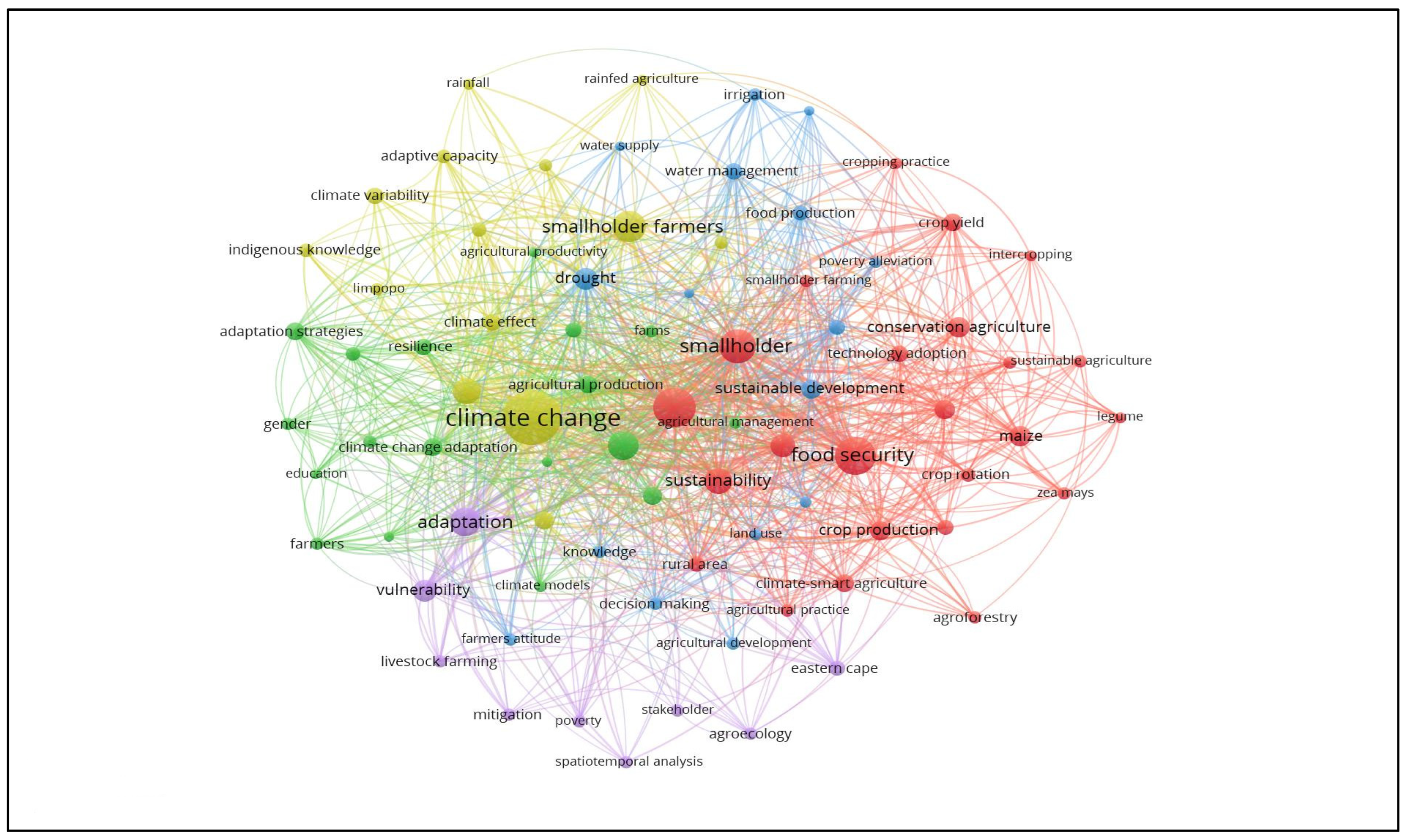 | Green cluster | Climate change adaptation and resilience | Climate change adaptation, adoption, climate models, agricultural management, adaptation strategies, education, gender, farmers’ knowledge | Sociocultural and agro-ecological strategies, knowledge and skills are important in climate change mitigation and building resilience. |