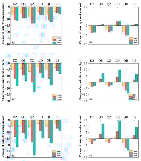 Change in maturity durations in the 2050s (2041–2060), 2070s (2061–2080) and 2090s (2081–2100) under SSP1-2.6 (a,b), SSP3-7.0 (c,d), and SSP5-8.5 (e,f) compared with the baseline.