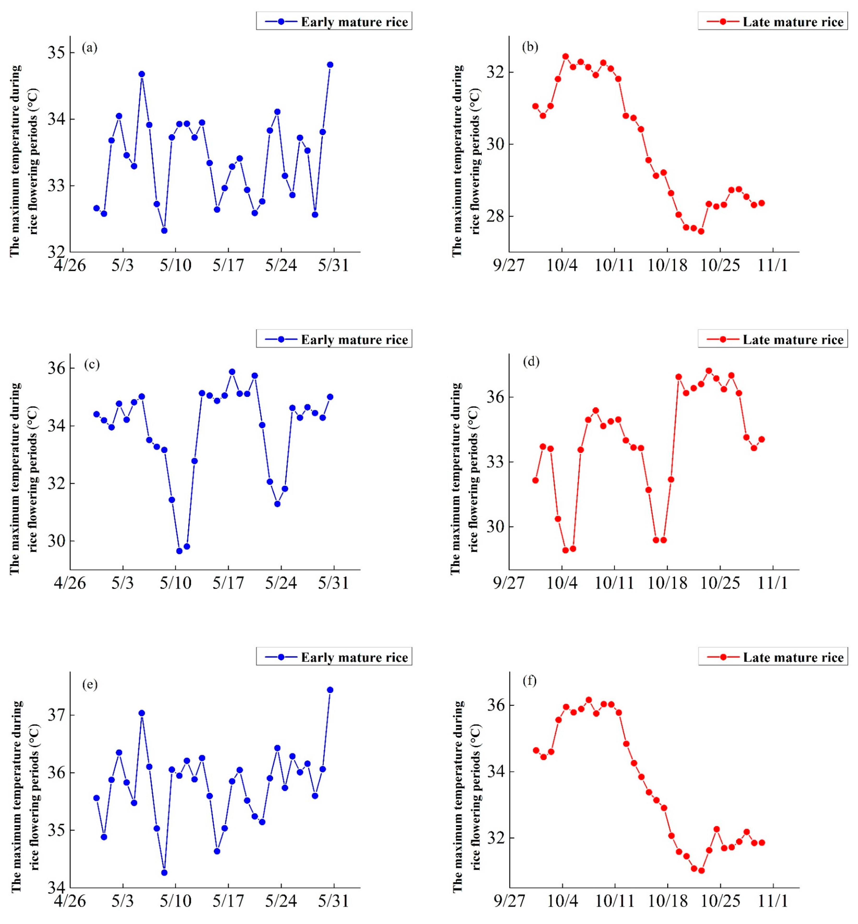 | Cultivar | The Maximum Temperature During Rice Flowering Periods (°C) | ||