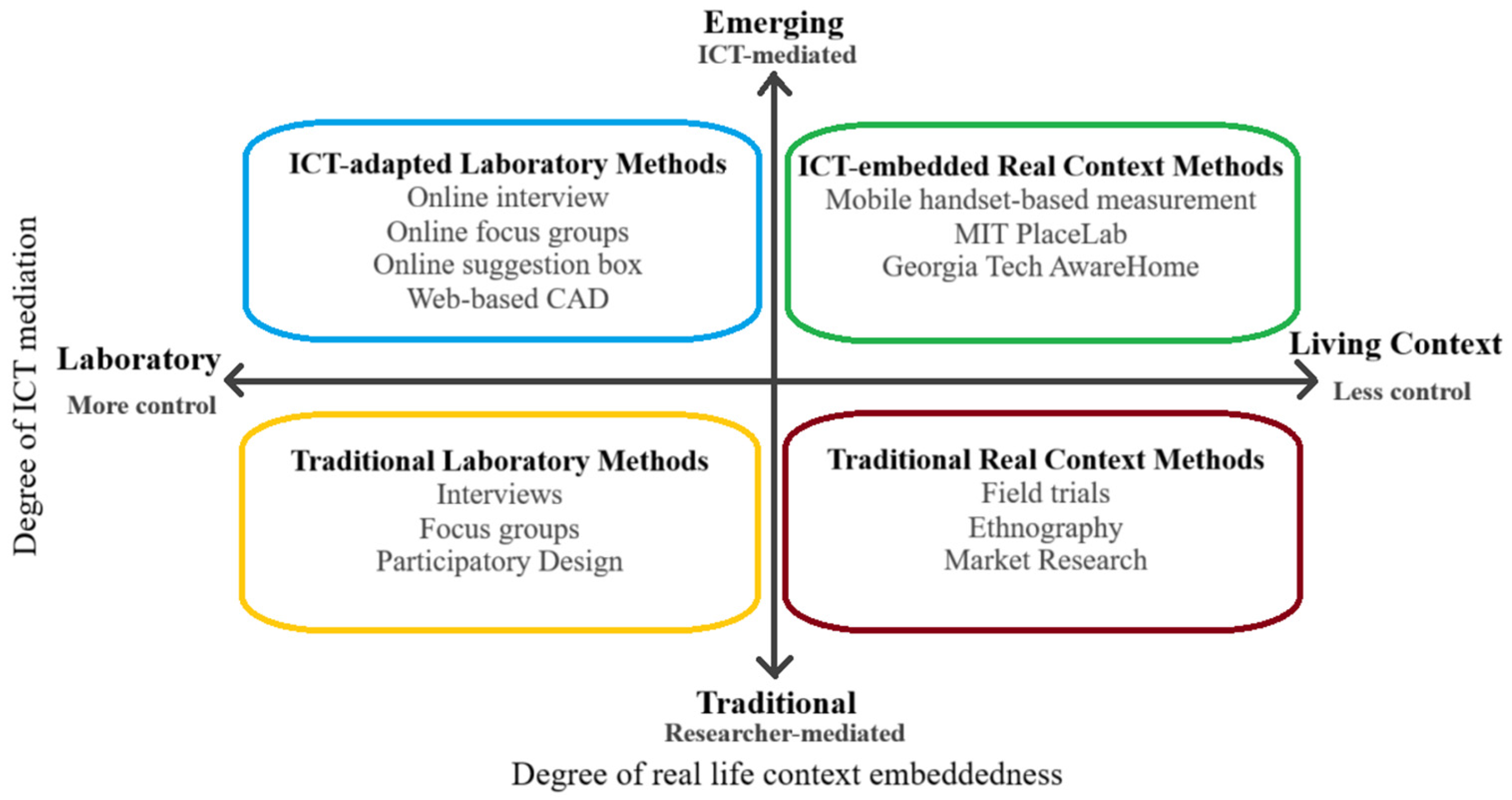 Together, these dimensions allow for a comprehensive understanding of how LLs function as socio-technical systems. They cover the structural, behavioural, methodological, and temporal aspects of Living Lab operations, capturing both the conditions that enable innovation and the results it produces. This methodological tension can be situated within the four quadrants of Living Labs, which distinguish between laboratory-based and real-context methods, as well as between traditional and ICT-mediated approaches (
