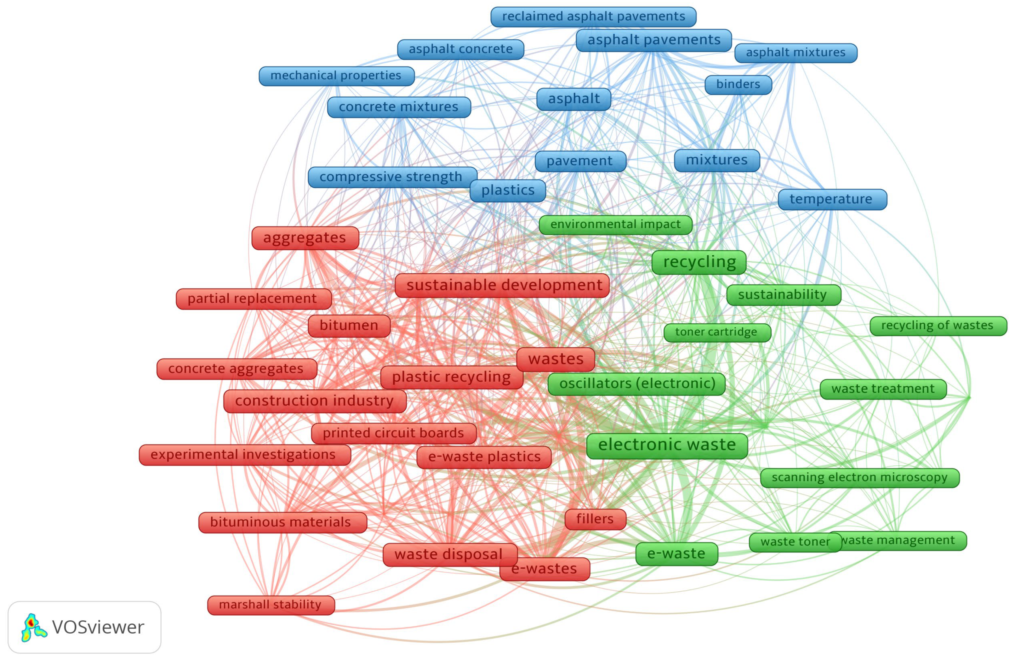 | Scopus | (TITLE-ABS-KEY (“e-waste” OR “electronic waste” OR “waste toner” OR “PCB waste” OR “NMF” OR “waste plastic” OR “ABS” OR “HIPS”)) AND (TITLE-ABS-KEY (“asphalt” OR “bitumen” OR “pavement” OR “asphalt concrete” OR “road construction” OR “asphalt modifier”)) | 152 |