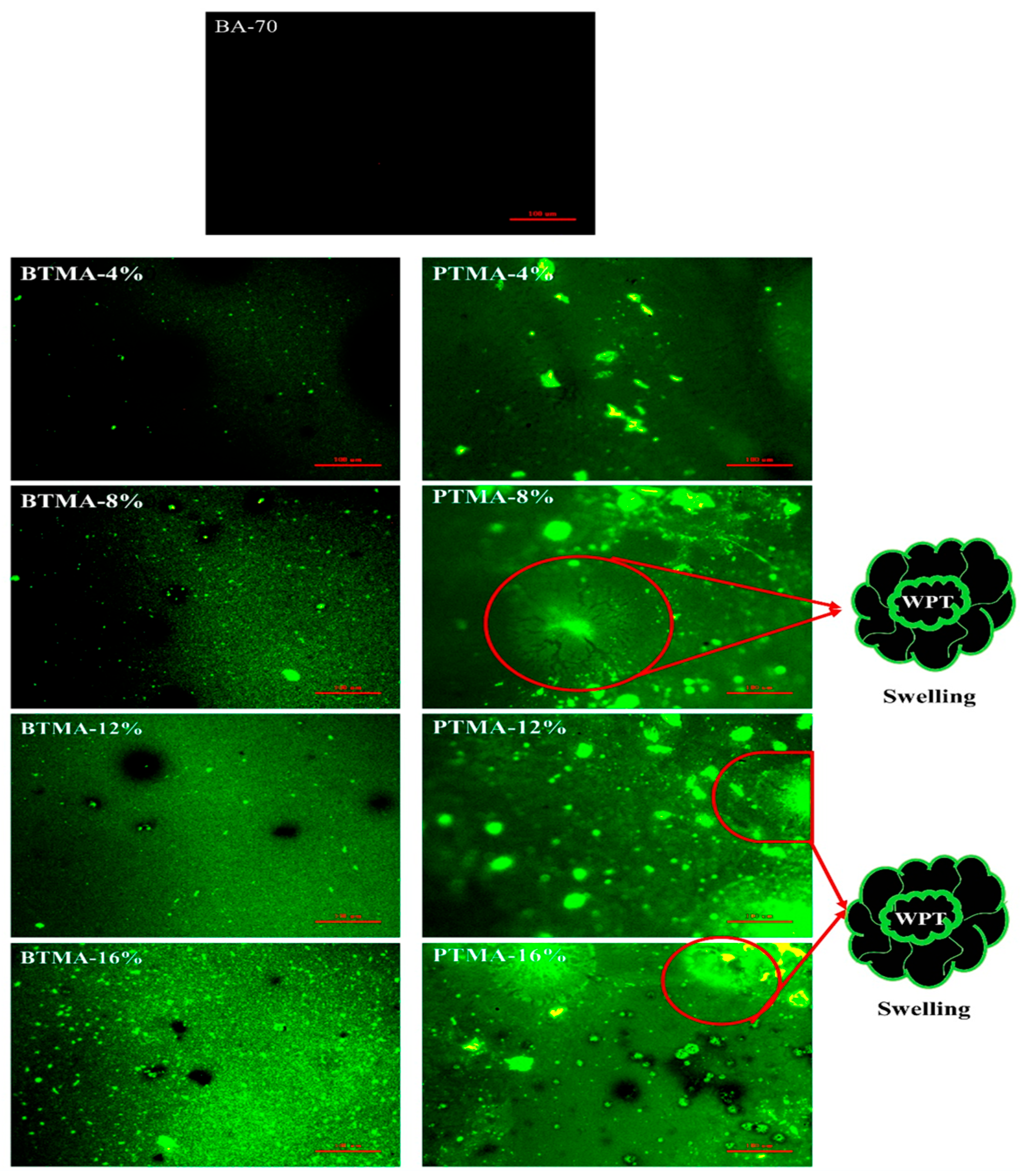 | WT [104] | Powdered | Asphalt binder modifier WT (0% and 8%) by binder weight and CCPO (0.5, 1.5%, and 2.5%) by weight of WT-modified binder. | WT-modified asphalt binder combined with biobased CCPO | Storage stability, self-healing, DSR, BBR, FM, FTIR, and ageing index, | WT improved self-healing; CCPO decreased viscosity, increased fatigue and low-temperature cracking resistance, and improved phase stability and compatibility; maximum efficiency with 8% WT and 2.5% CCPO | Rutting performance was decreased by increasing CCPO content (lower G*/sinδ, %R, and higher Jnr); at lower CCPO dosages, self-healing was initially lowered. |