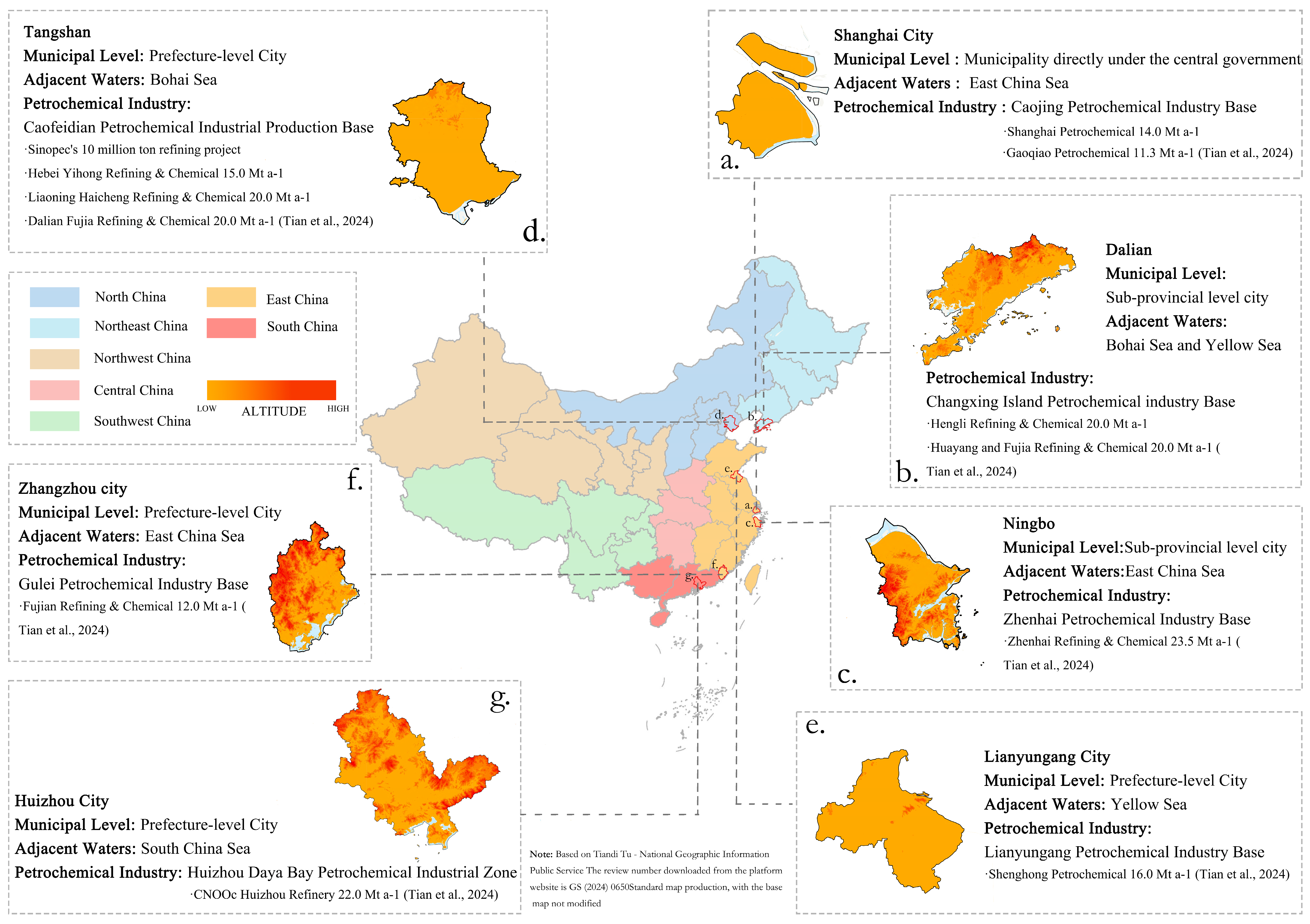- Water Environment: Research on chemical pollution is highly skewed, and studies on physical pollution are particularly few. Research contents show path dependence, favoring inorganic toxic pollutants to the study of combined pollution effects. There is a systematic bias in pollution source analysis, in which agricultural sources predominate, and port-characteristic sources are ignored. The association with the petrochemical industry is extremely weak.