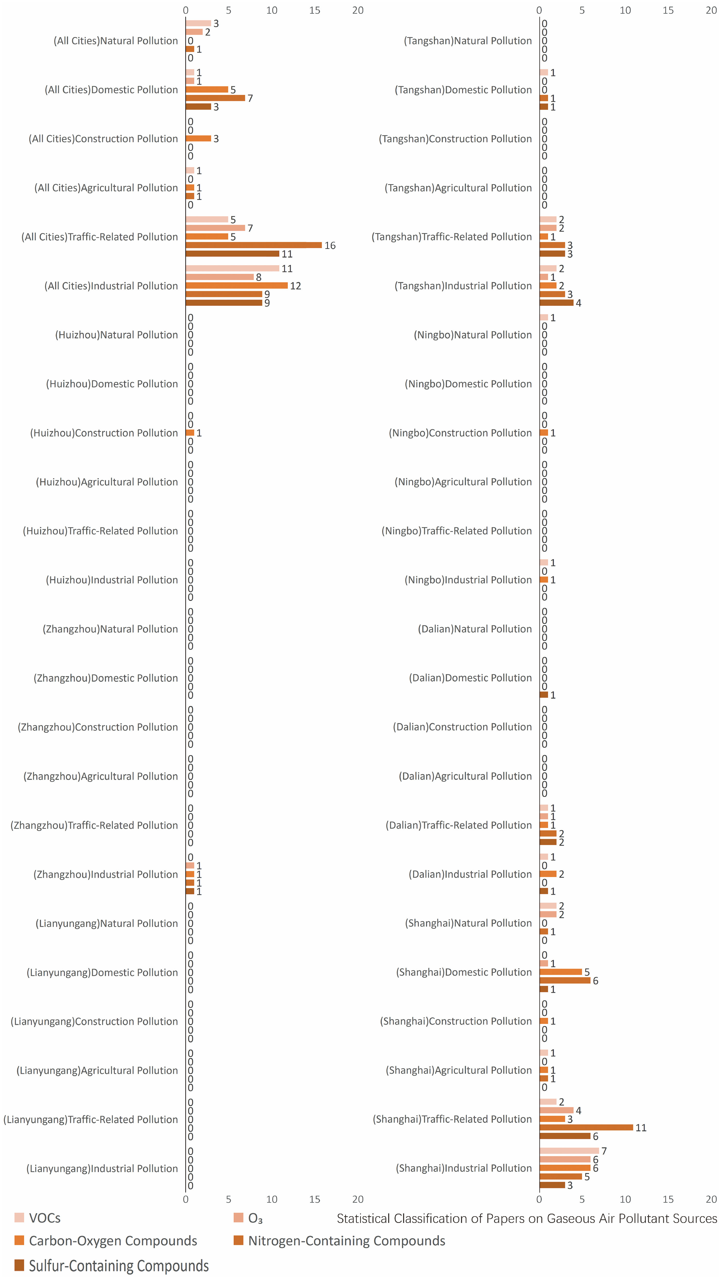 - Atmospheric Environment: Research resources are mainly concentrated in high administrative-level cities such as Shanghai, showing a significant urban selection bias. Investigative emphasis is on PM2.5 and nitrogen-containing compounds, with insufficient consideration given to PM1, PM10, VOCs, and other pollutants. Pollution source analysis shows a distinct imbalance, with industrial and transportation sources dominating research agendas, while construction and residential sources are distinctly understudied. An especially striking result is the severe lack of research explicitly associated with the petrochemical industry, as a profound disconnection from the fundamental industrial features of the cities studied.