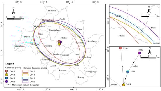 According to the calculation results in Table 4, with the help of ArcGIS 10.8 software, the centroid migration path of agricultural carbon emission efficiency in the Dabie Mountains was analyzed based on the standard deviation ellipse, as shown in Figure 5.