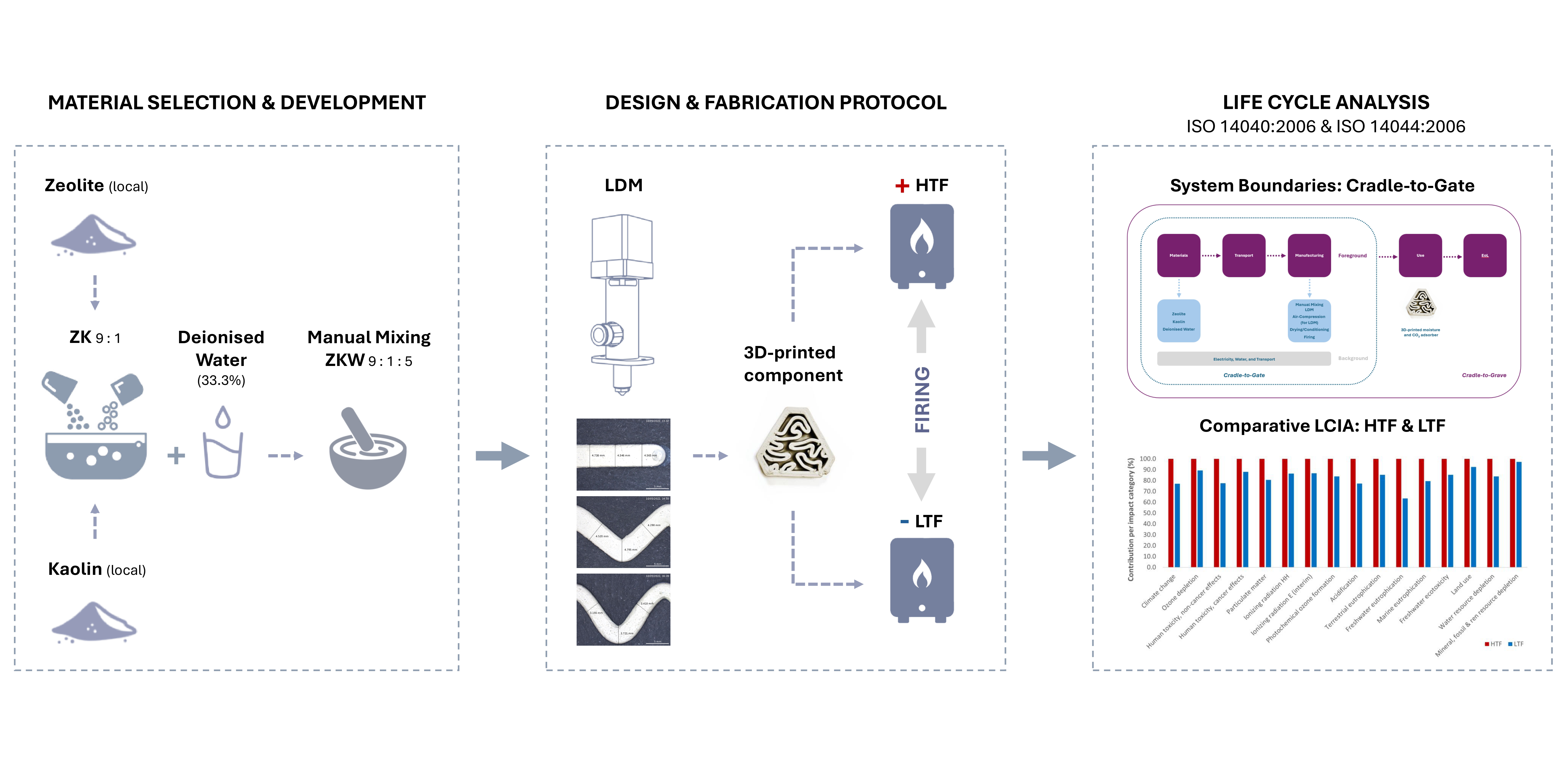 2 adsorption in indoor conditions and (b) to evaluate the environmental impacts across the selected components’ production stage through Life Cycle Assessment (LCA), with a special focus on climate change mitigation. The dual-function components are fabricated using Liquid Deposition Modelling (LDM), an AM technology based on customised slurry-based feedstock materials. LDM was selected for the present study because the rheological properties and composition of the feedstock material, as well as the targeted component geometries, aligned closely with the operational requirements of slurry-based extrusion. Although other AM approaches, such as Stereolithography (SL), Inkjet Printing (IJP), or Direct Ink Writing (DIW), are capable of processing ceramic materials [