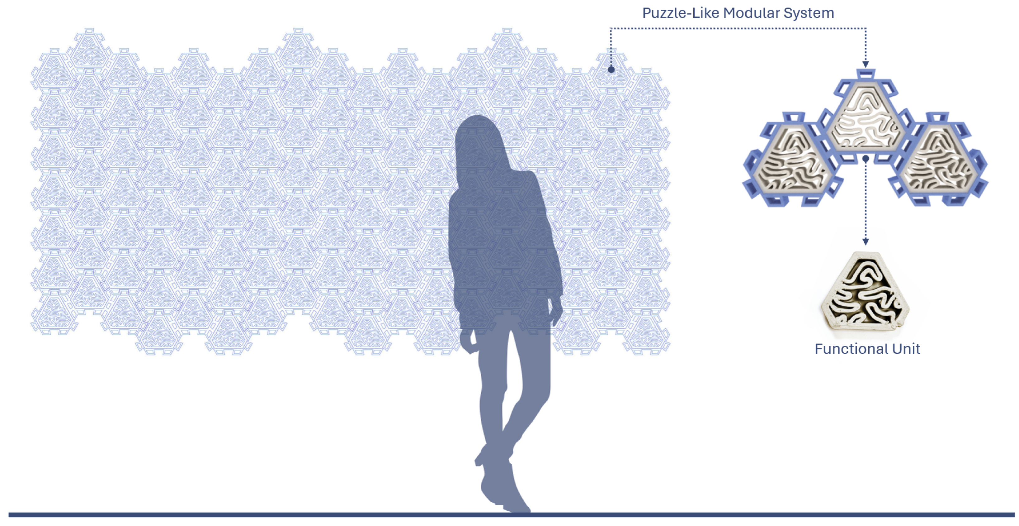 Figure 2) facilitates adaptive expansion, supporting customisable layouts in which elements can be added, removed, or rearranged according to the design requirements in terms of performance and aesthetics. The approach was selected for its simplicity, structural integrity, and applicability to a range of use cases, including space dividers or architectural facades.