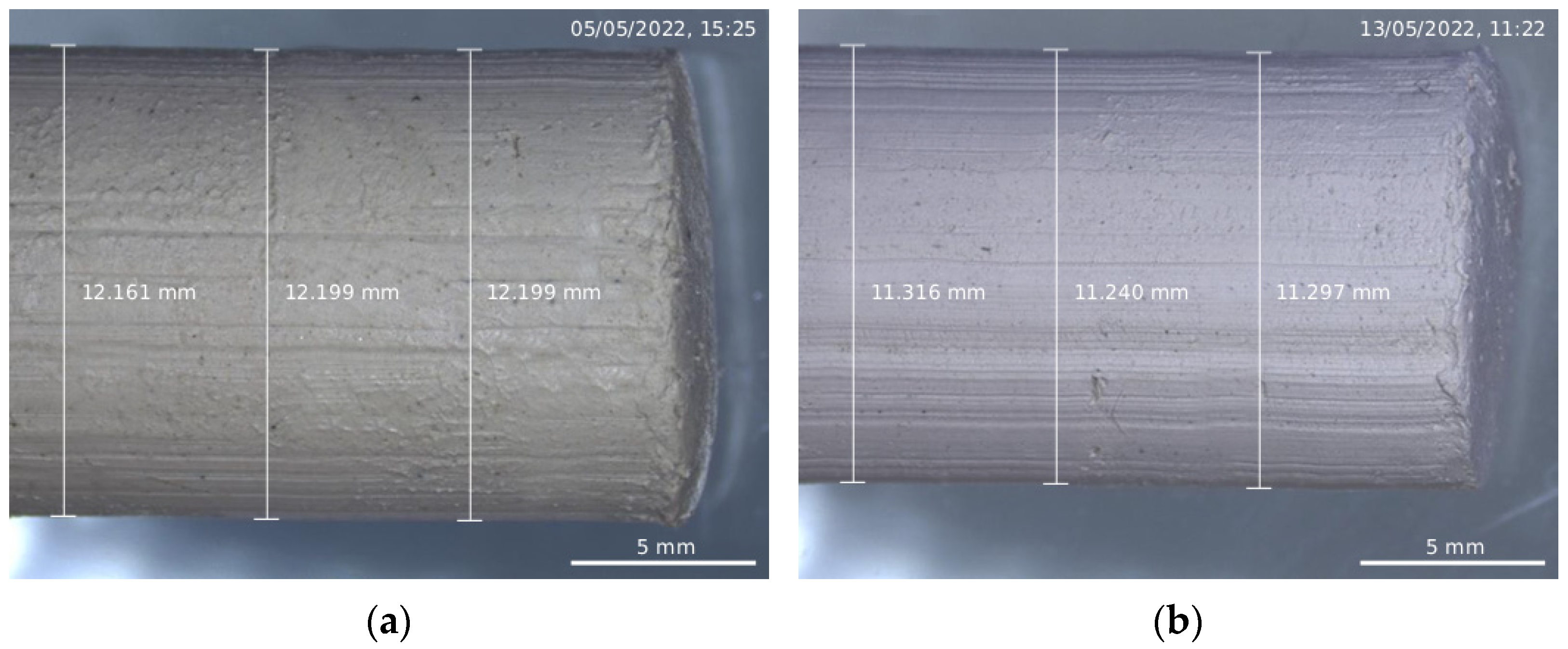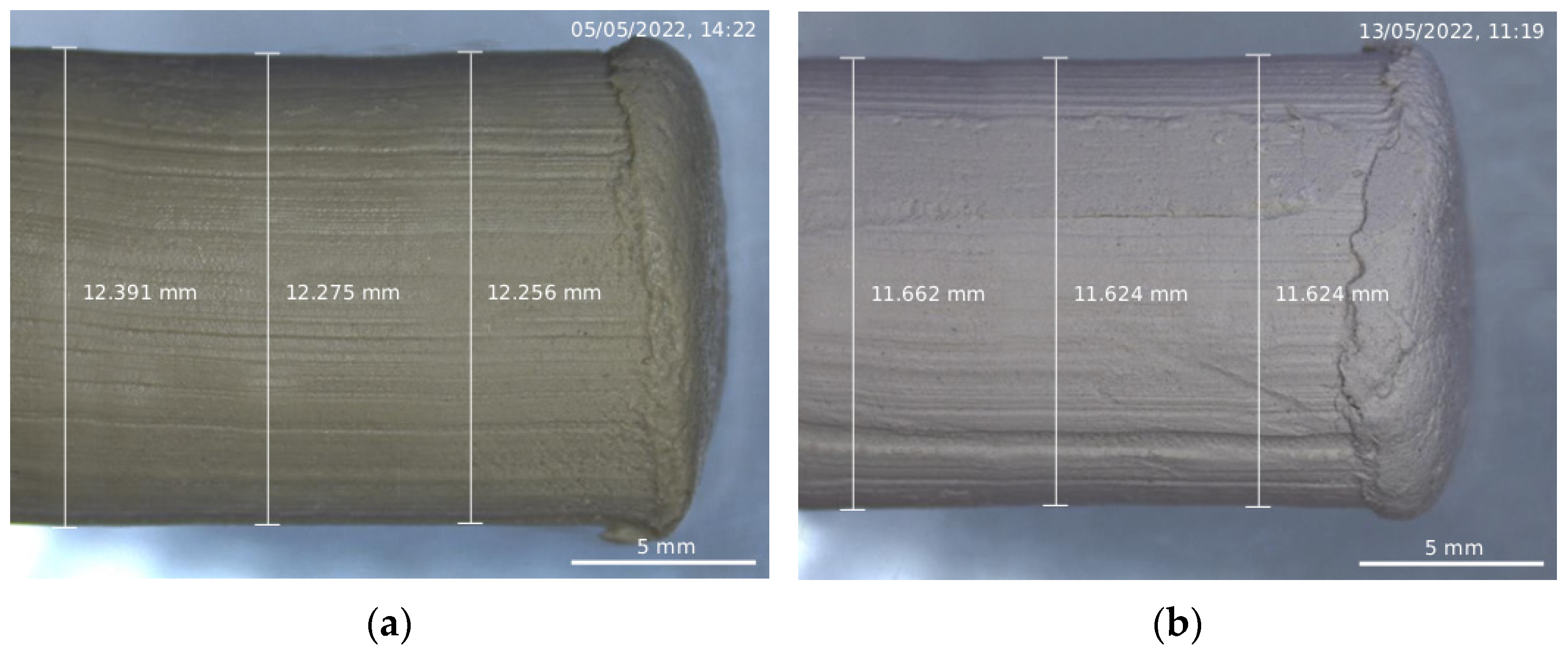 Monitoring of manually extruded KW10:5 specimens: (a) humid and (b) dried after >7 days.