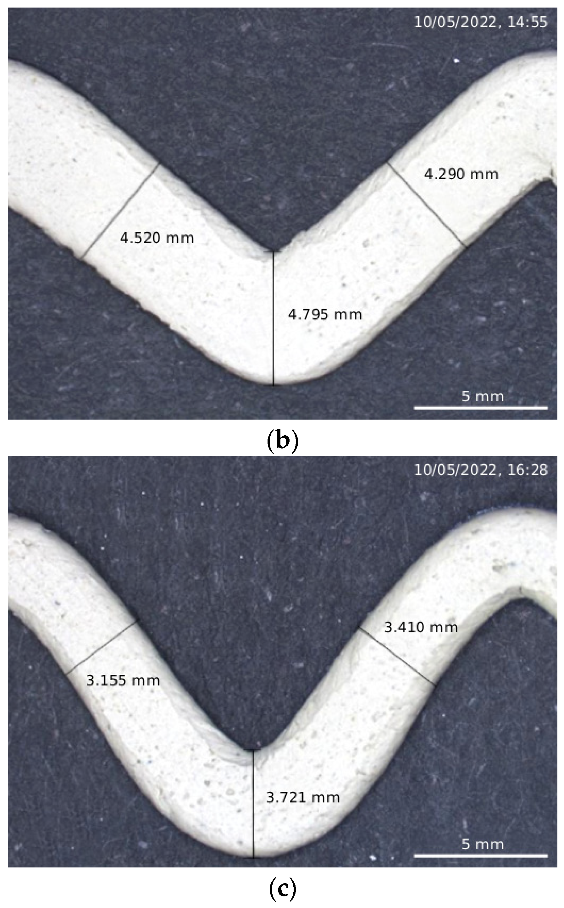 Figure 5). The aim was to maintain consistent layer width, particularly at points of geometric deviation, throughout the printing process. Negligible dimensional shrinkage was observed in curved toolpaths (