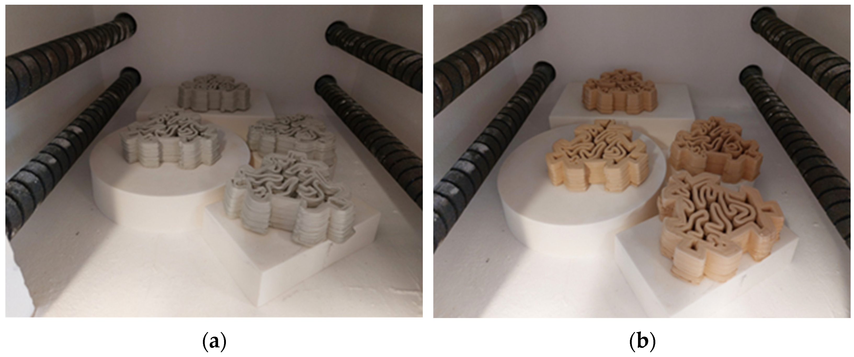 - Ordoñez, E.; Gallego, J.M.; Colorado, H.A. 3D Printing via the Direct Ink Writing Technique of Ceramic Pastes from Typical Formulations Used in Traditional Ceramics Industry. Appl. Clay Sci. 2019, 182, 105285. [Google Scholar] [CrossRef]