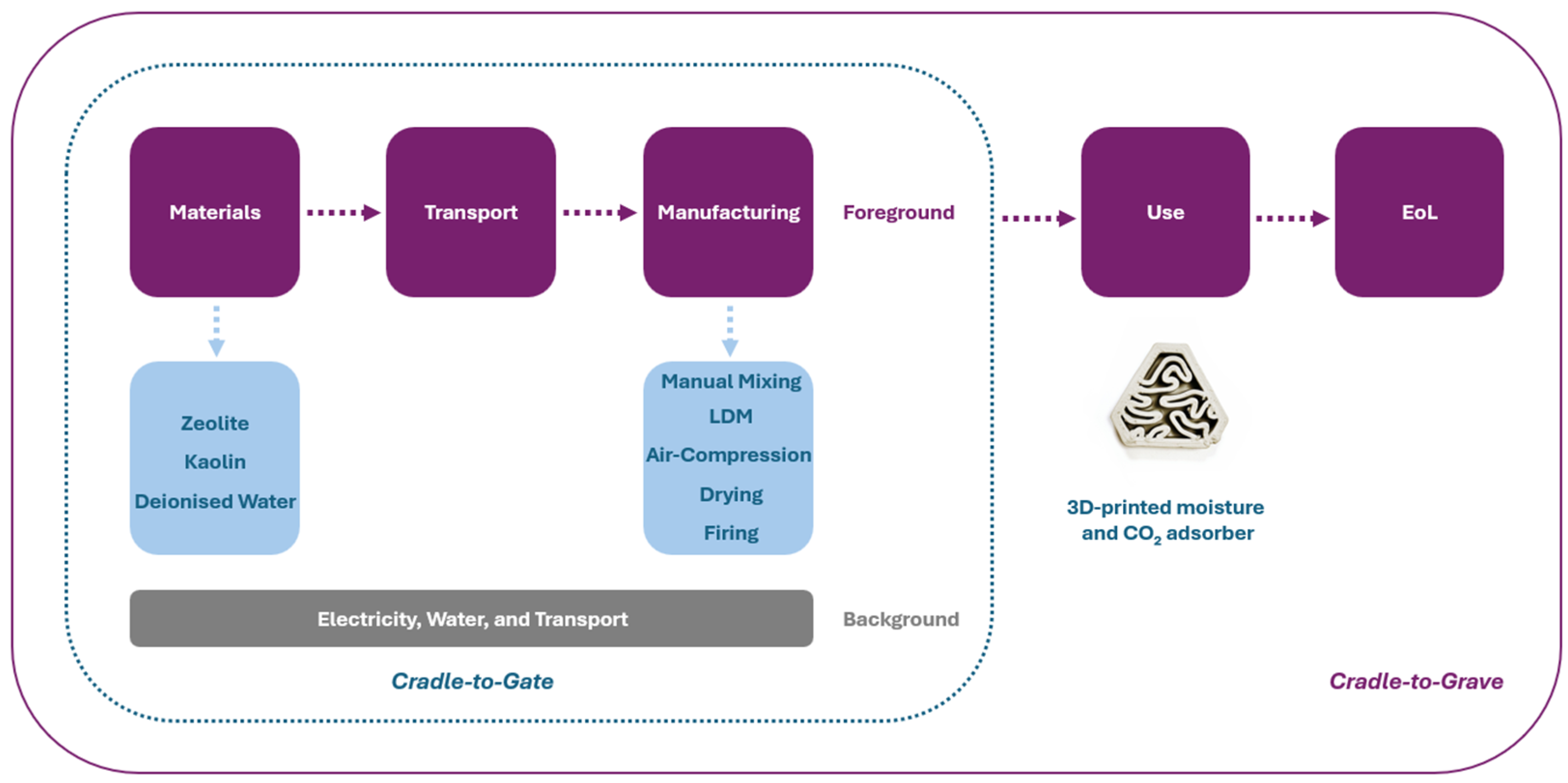 22], to the best of the authors’ knowledge, no prior research has investigated the development of multi-functional materials for indoor applications based on LDM processes that simultaneously consider a comprehensive evaluation of their environmental footprint. Currently, the literature on LCA of 3D-printed ceramics is very limited, with most studies primarily focusing on structural performance, rather than the environmental impacts [