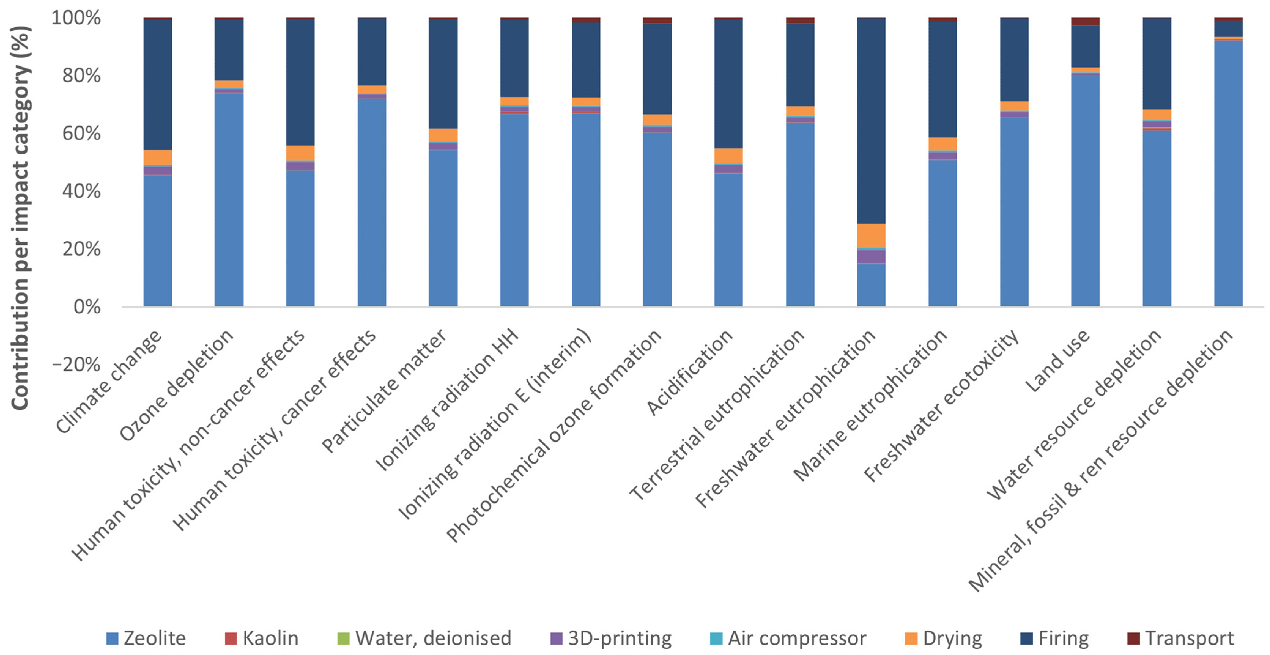 It is also evident that the electricity demands associated with the firing process and the use of Zeolite, are the predominant contributors across all impact environmental categories examined. Zeolite predominates the “Mineral, fossil, and renewable resource depletion” category, accounting for over 90% of the impact due to the raw ore mining, leading to the depletion of natural resources. By contrast, Kaolin, used at a 1:9 mass ratio relative to Zeolite, as well as the deionised water, have negligible impacts across all categories addressed. Finally, it is observed that the transport of materials to the manufacturer is also negligible, as all materials are locally sourced.