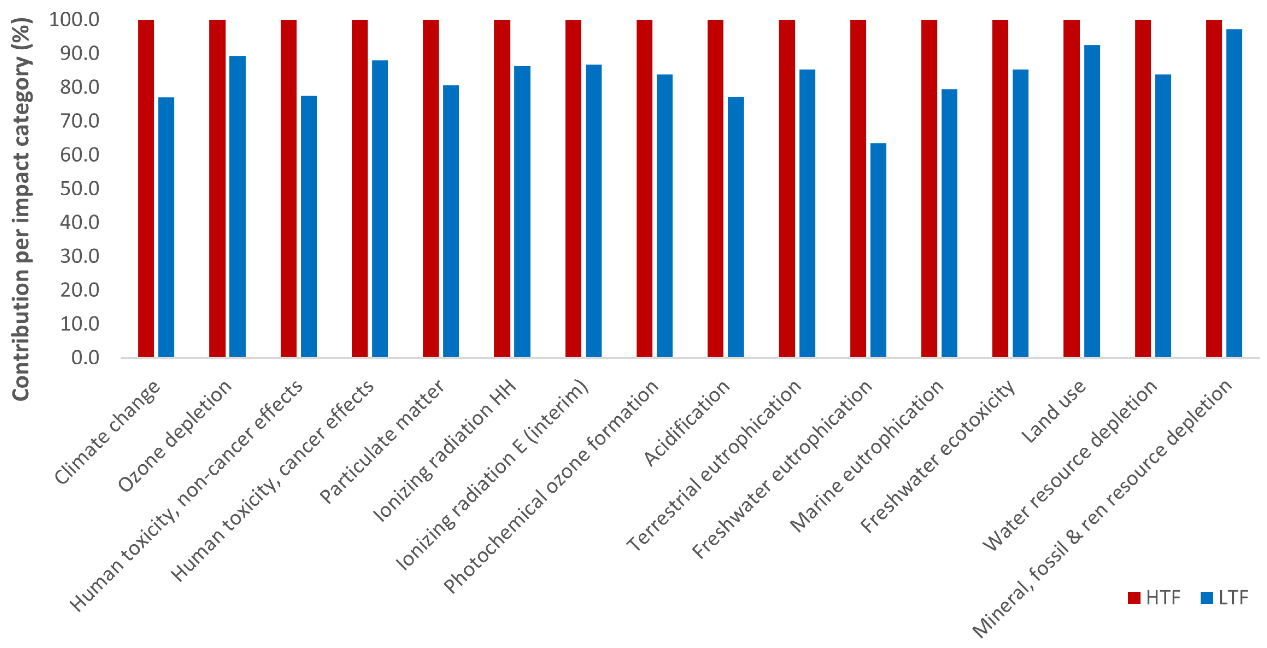 Table 4 presents the absolute values of the comparative LCA results for the HTF and the LTF Protocols by the environmental impact category addressed, including the percentage reduction observed when transitioning from HTF to LTF for the production stage of the 3D-printed component.