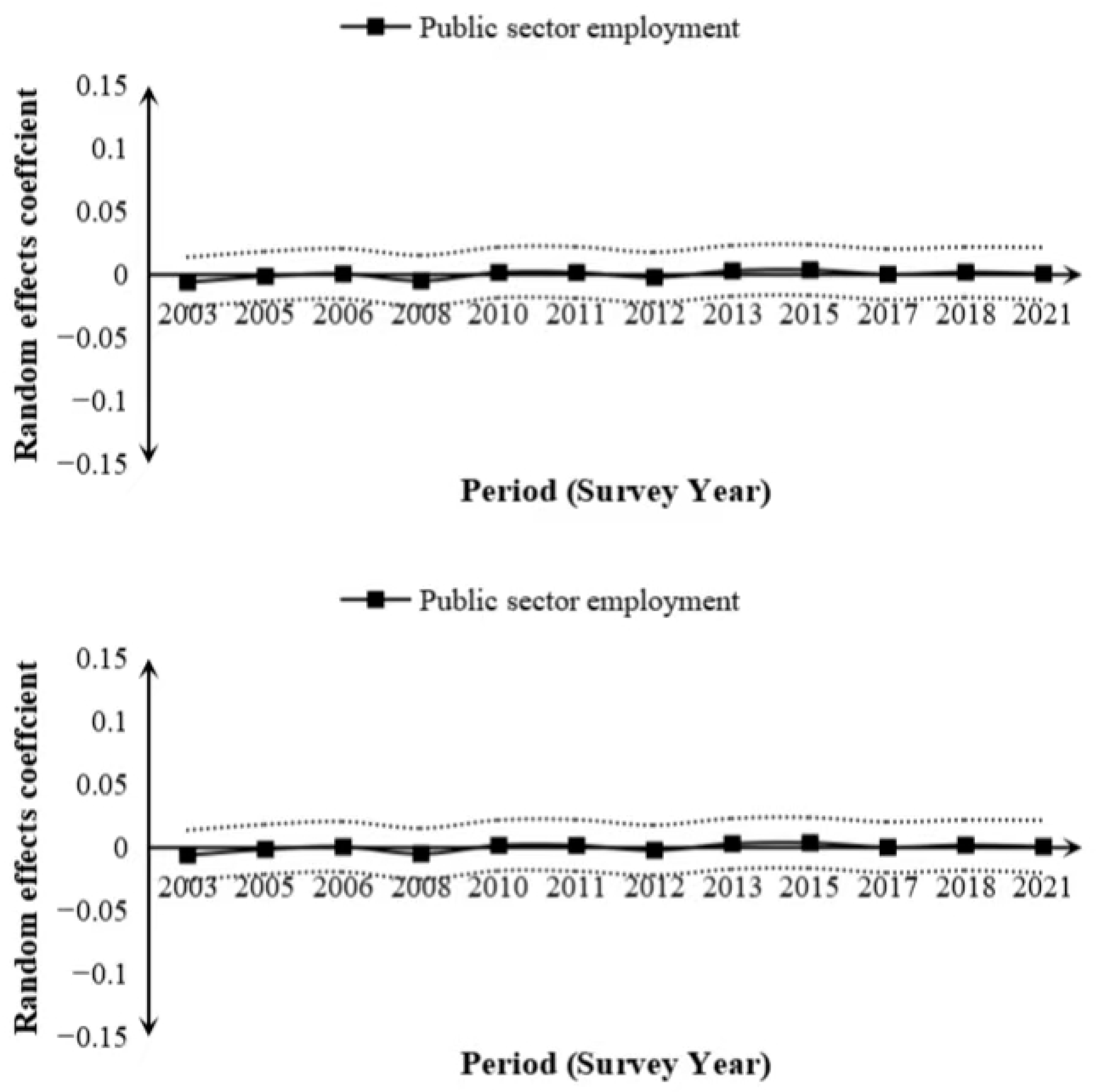 | Period-level slope SD (public sector employment × male) | 0.0002 * (0.0009) | ||||