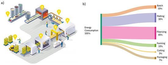 (a) Production stages of glass wool thermal insulation manufacturing: 1. Batching, 2. Melting, 3. Fiberizing, 4. Curing, 5. Cutting, 6. Packaging [2]; (b) Sankey Diagram showing the energy consumption percentages of a typical glass wool production process. Source: Drafted by authors.