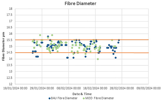 Figure 3 shows the glass fiber diameter measurements from the two fiberizing units over the sampling period in order to ascertain any compromise in fiber quality. Specifically, it has taken into account the MOD refractory trial to monitor any variations in the quality of fiber while attaining efficiency measures. The ideal range for fiber diameter for optimum fiber quality is considered as between 14.5 and 15.5 µm, and both BAU and MOD refractory machines were noted to produce fibers within this acceptable range.