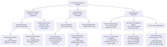 The findings can be interpreted as suggesting that South Korea’s Ecological Sports curriculum, while demonstrating strong capacity for ethical internalisation, may be viewed as having scope for integrating selected operational features of China’s instrumental rationality approach to help establish a more balanced dual-track progression of skills and ethics. Such integration does not imply replacing qualitative orientations, but can be understood as complementing them with modest quantitative anchors to enhance clarity, transparency, and scalability across diverse educational contexts.