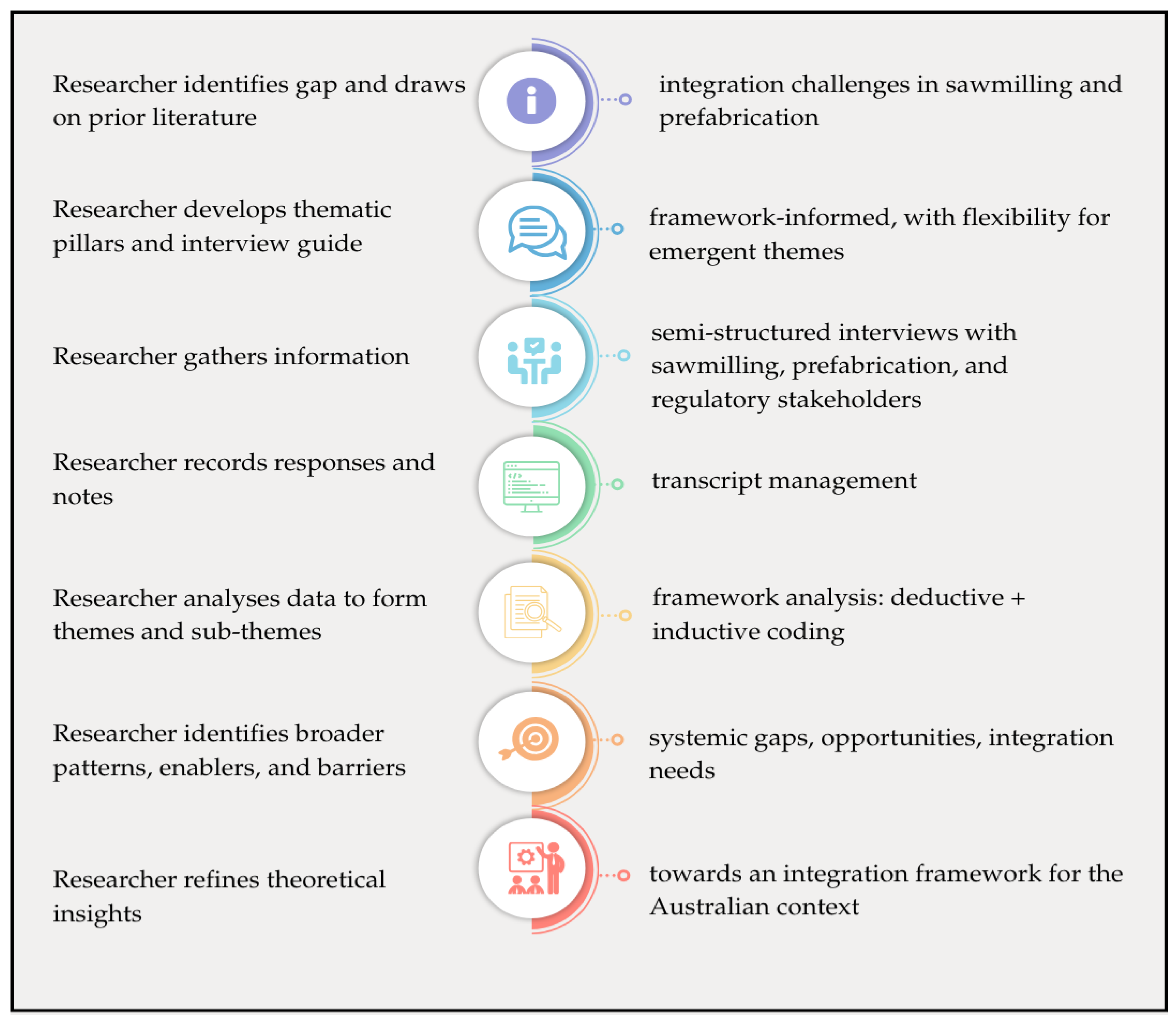Figure 1. Methodological workflow for a framework-informed qualitative study of sawmilling–prefabrication integration.