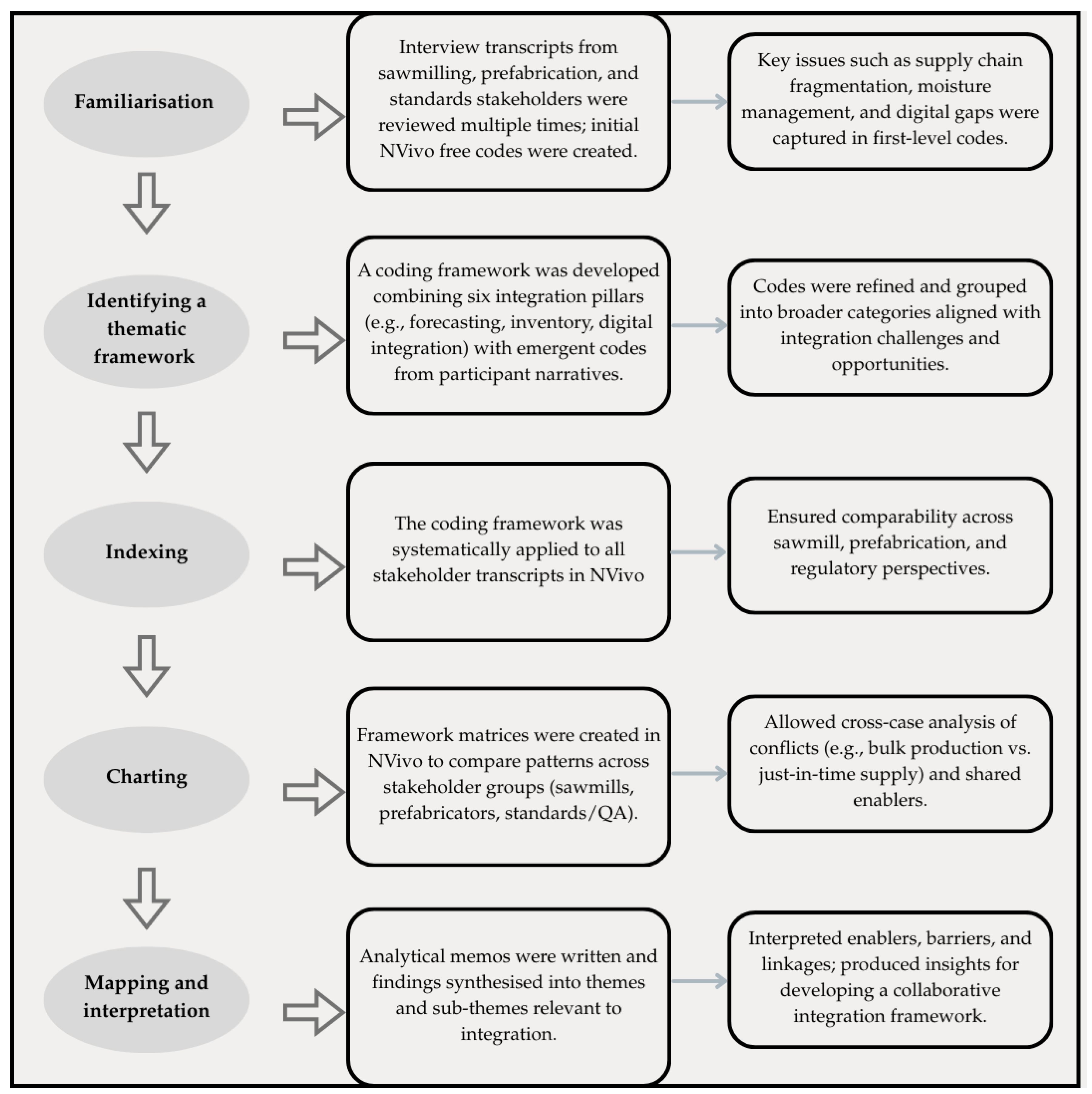 Figure 2. Stages and processes in framework analysis applied to the sawmilling–prefabrication integration study.