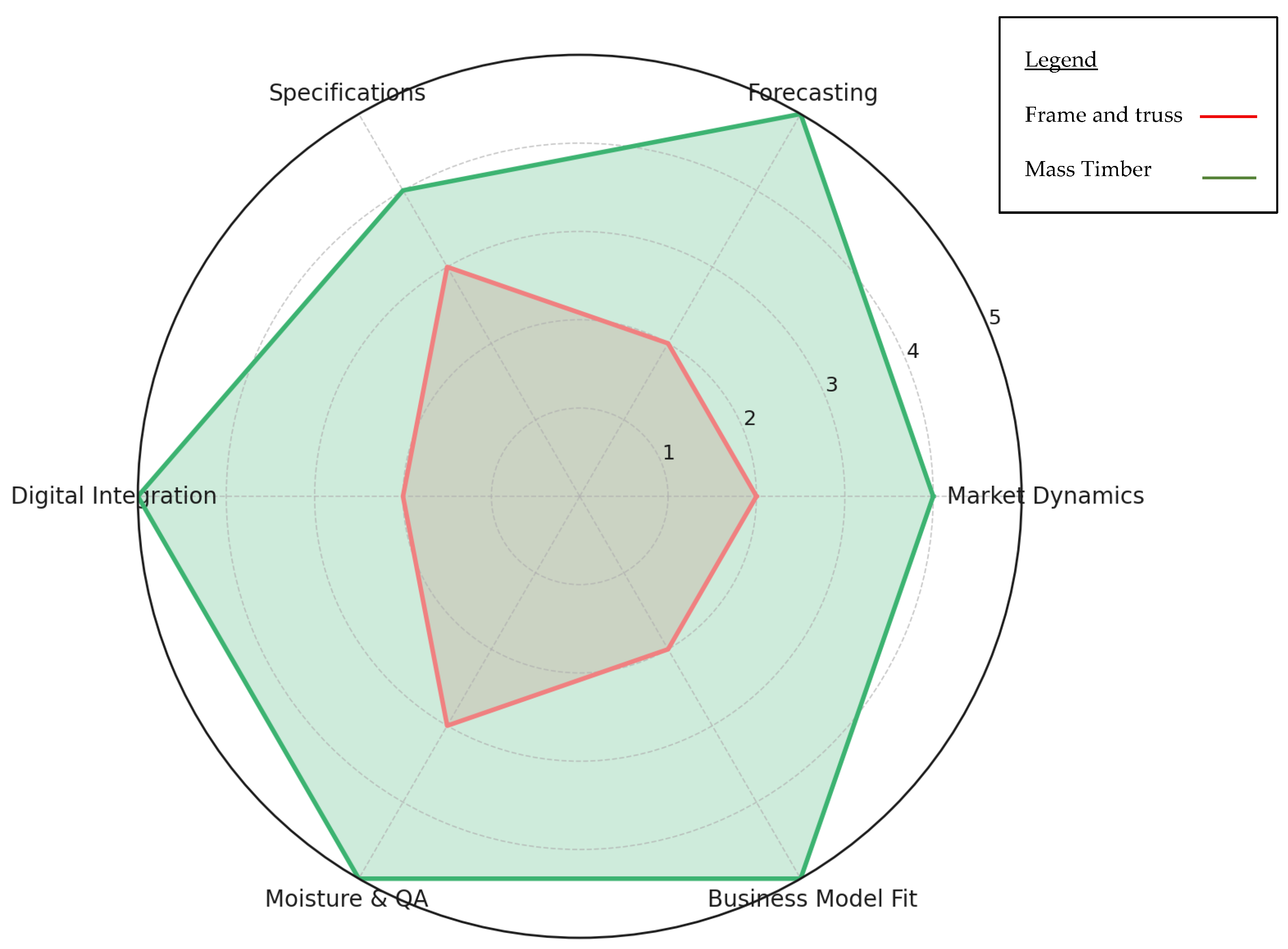 Figure 6. Applicability profile of frame and truss and Mass timber prefabrication. Ratings are based on a five-point qualitative scale (1 = very low applicability; 5 = very high applicability).