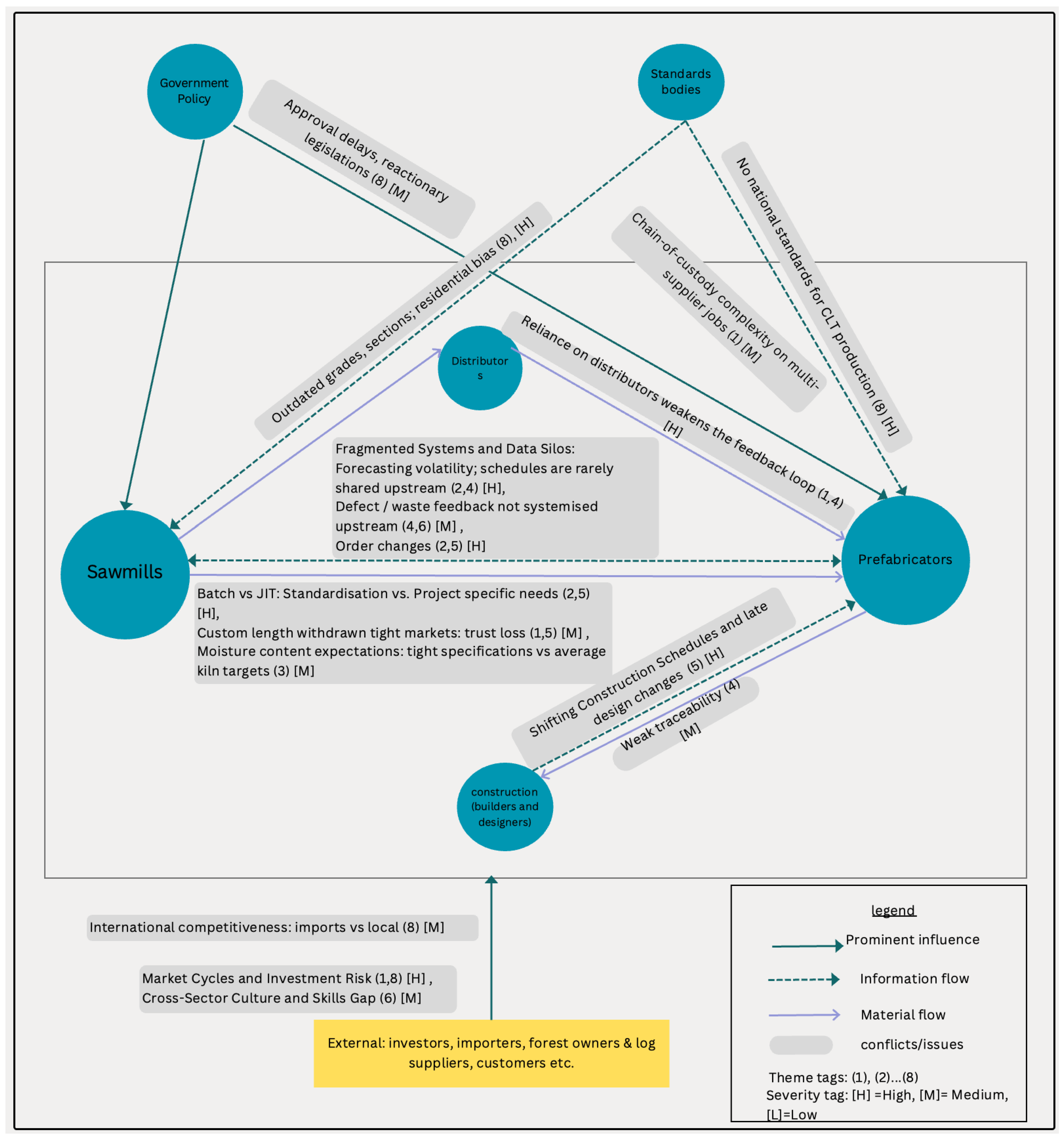 Procurement-related challenges also emerged as a barrier. One manager explained that greater visibility could improve efficiency but would require changes in procurement processes: “if sawmills had visibility of demand and upcoming projects in the pipeline, how would that affect procurement, especially competitive tendering?” (P04). In a similar vein, prefabricators expressed frustration at late-stage design changes and a lack of clarity about project pipelines, which prevent sawmills from adjusting production schedules effectively.