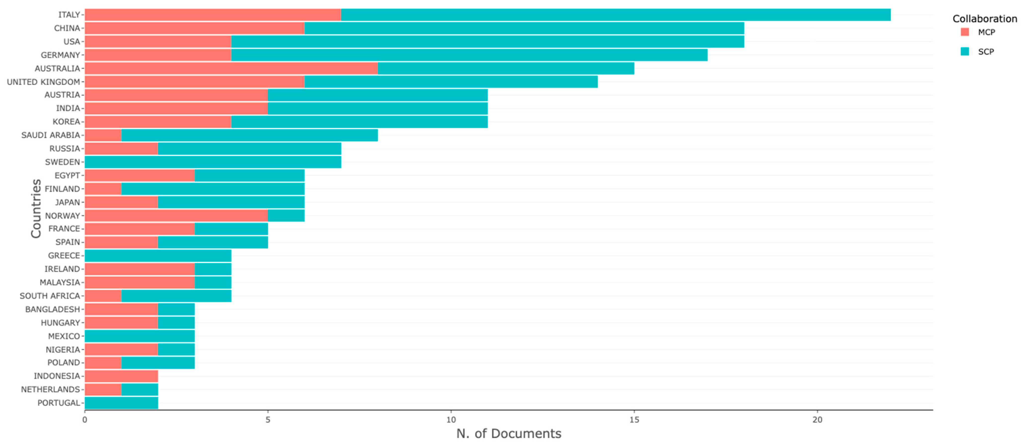 Figure 3 also enables inferences about the collaborative profile of the scientific community. Countries with higher proportions of MCP tend to participate in consortia, bilateral partnerships, or international thematic networks, which contributes to the diversification of perspectives and to increased publication impact.