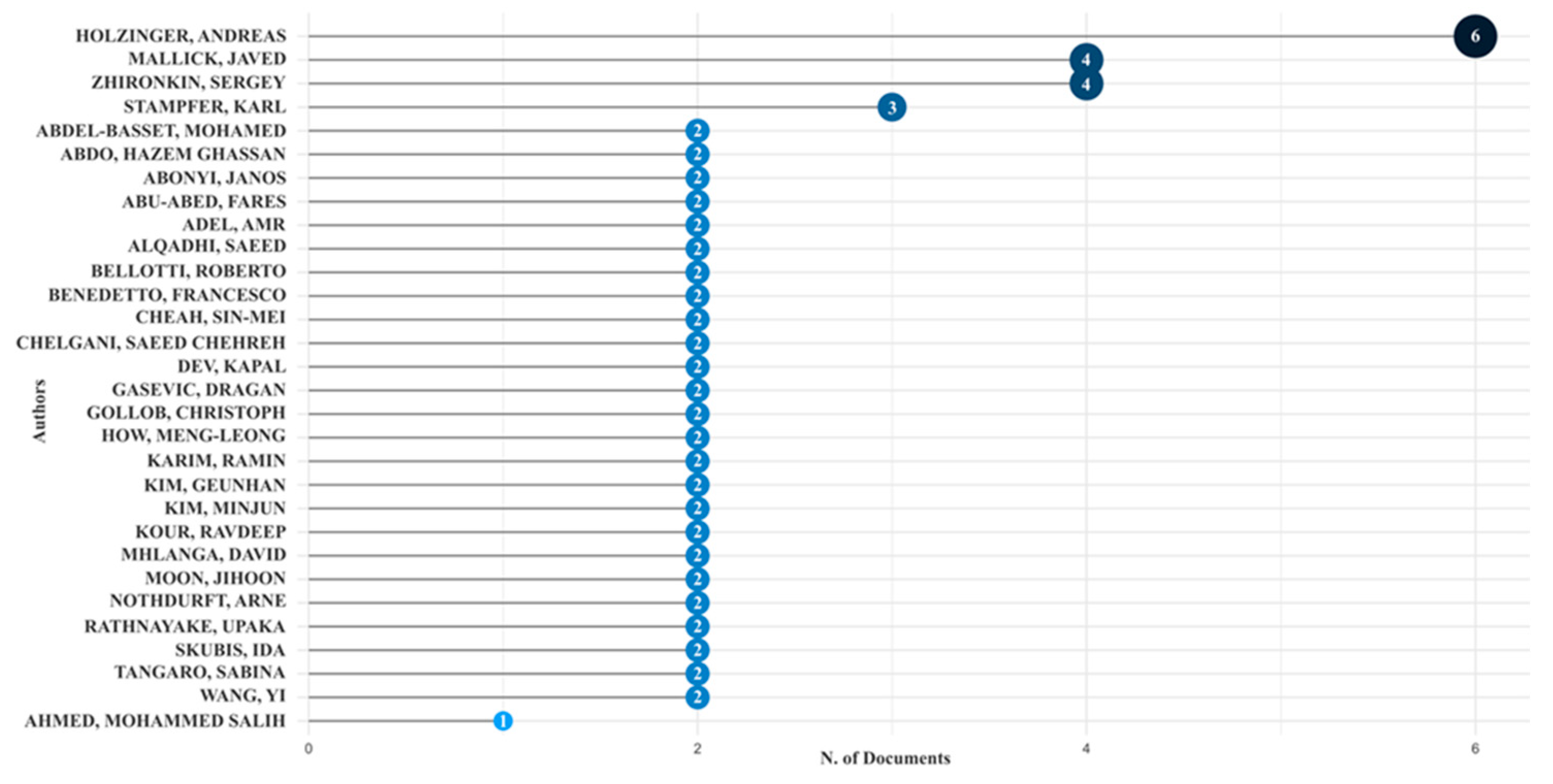 Figure 4 shows that the author Andreas Holzinger leads scientific output, with six publications. He is followed by Javed Mallick and Sergey Zhironkin, with four articles each, and Karl Stampfer, with three. There is also a group of twenty-five authors with two publications each, indicating consistency in their contributions.