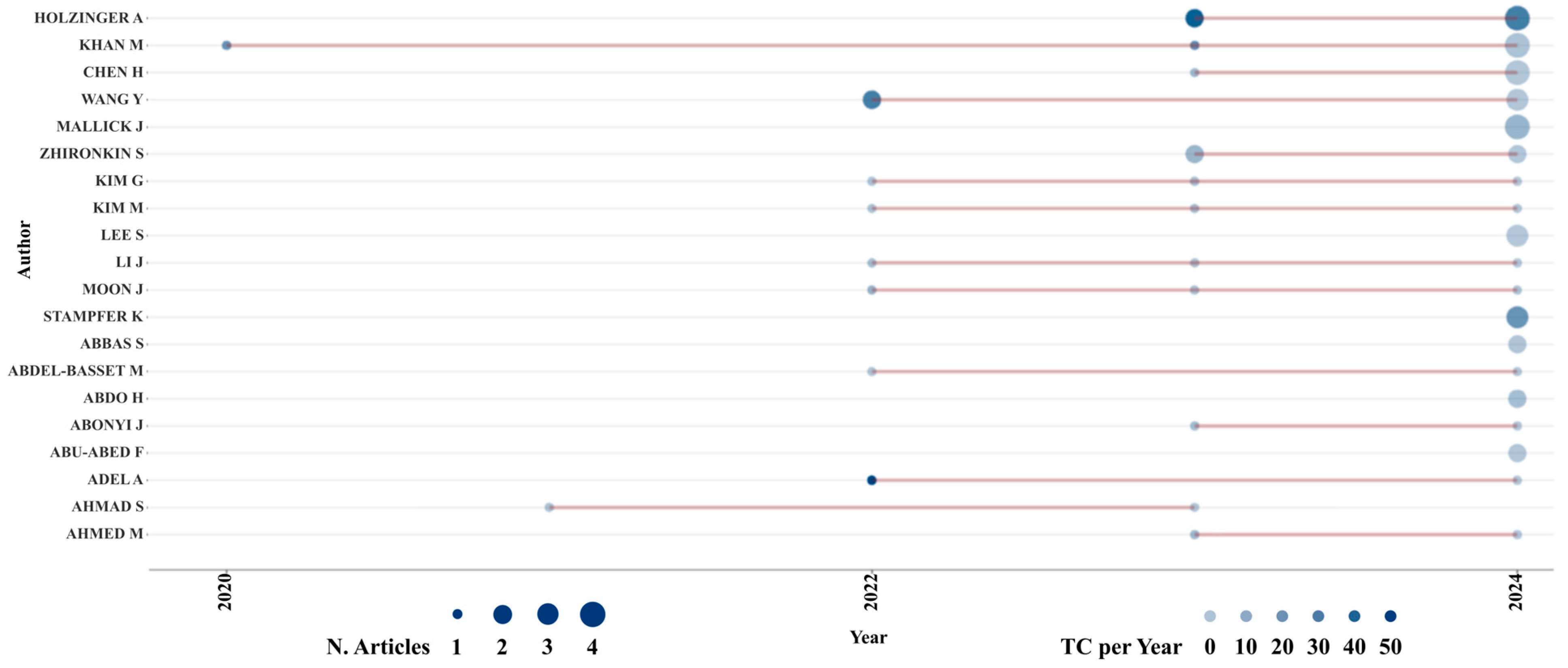 Figure 5 presents the evolution of publication volume for the 20 most productive authors in the corpus and the citations received per year for their works. Each line corresponds to an author; the points mark years in which publications occurred. Bubble size represents the number of articles published in the period for a given author (N. Articles), while color intensity indicates the total citations per year (TC per Year) associated with their contributions. This visualization allows productivity and normalized impact over time to be observed simultaneously.