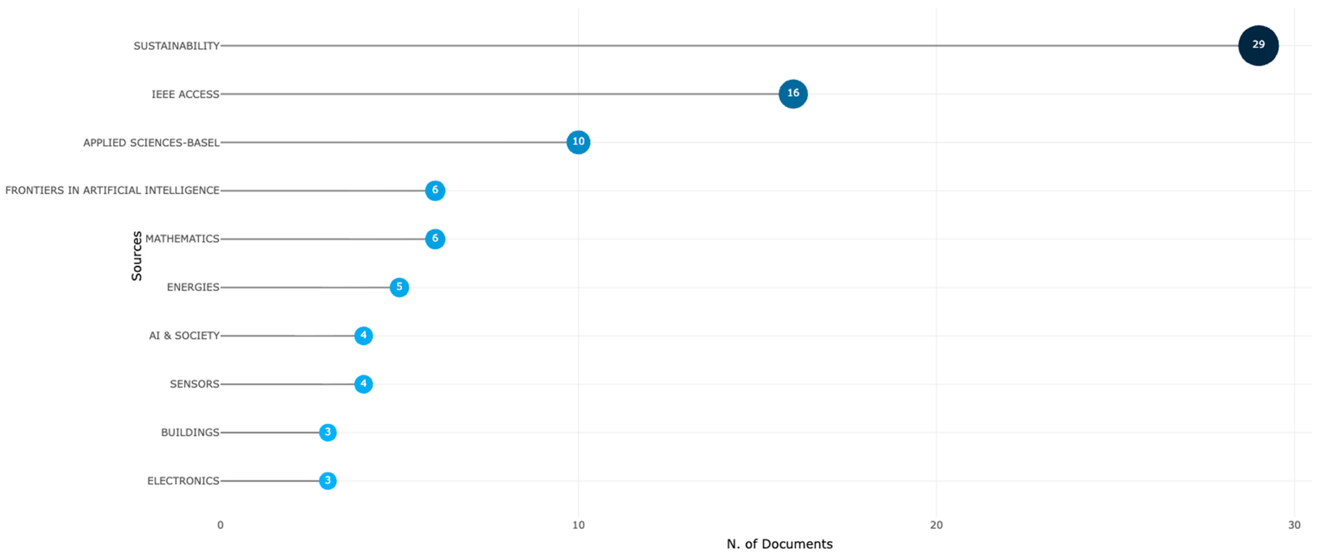 The predominance of Sustainability is marked and consistent with the study’s focus on Human-Centered Artificial Intelligence applied to Sustainable Development. Relative to the corpus of 265 articles, Sustainability accounts for approximately 10.9% of the total, whereas IEEE Access comprises about 6.0% and Applied Sciences about 3.8%. In terms of the absolute difference, Sustainability publishes 13 more articles than IEEE Access and 19 more than Applied Sciences; in ratio terms, it corresponds to roughly 1.81 times the volume of IEEE Access and 2.9 times that of Applied Sciences. This gradient indicates an editorial venue particularly receptive to intersections between AI and sustainability, alongside engineering- and applied-science outlets that serve as complementary channels. The result suggests that a substantive portion of the debate consolidates in journals with an interdisciplinary scope, with meaningful diffusion toward socio-environmental applications, while maintaining a consistent technical base in engineering and computing venues.