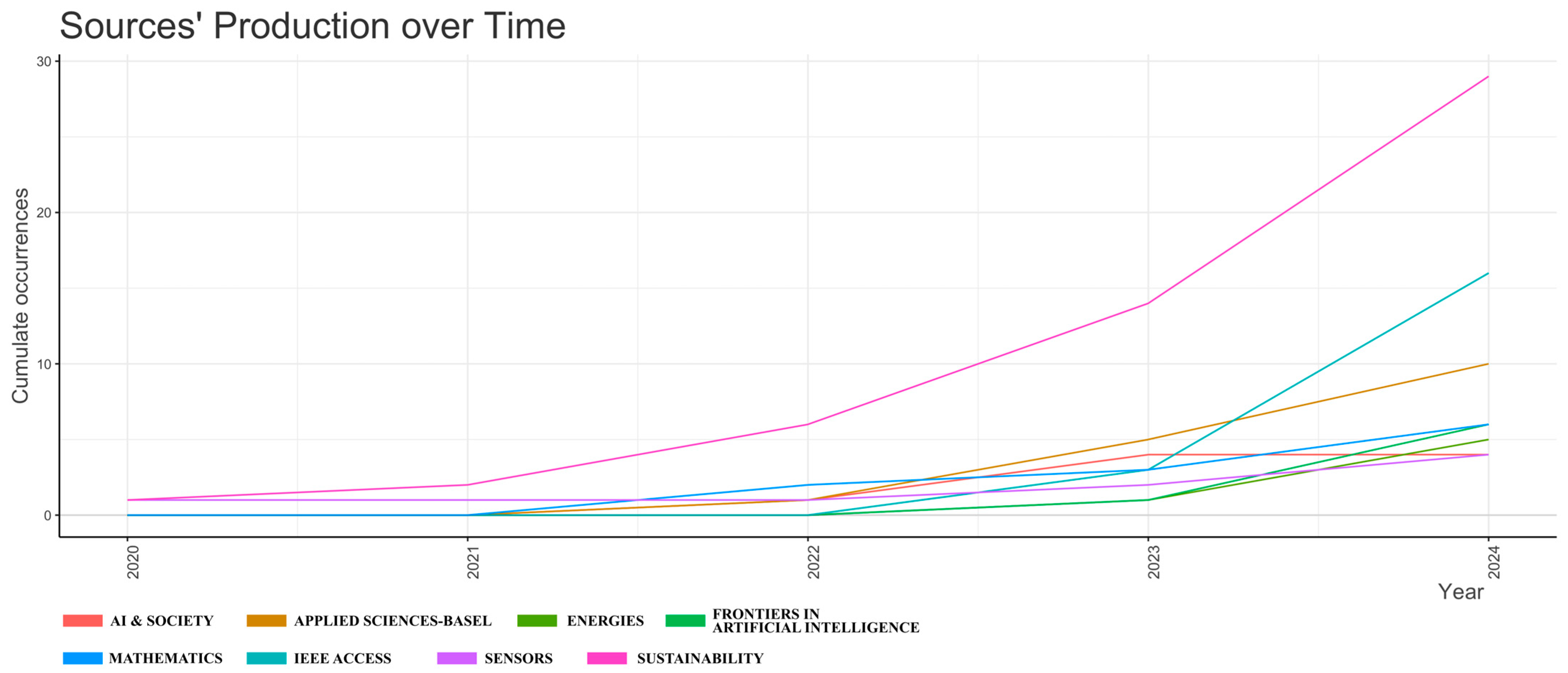 Figure 7 presents the cumulative output by journal between 2020 and 2024. Each line corresponds to a journal, and the value on the vertical axis indicates the cumulative number of articles from that journal in the corpus over time. The chart in