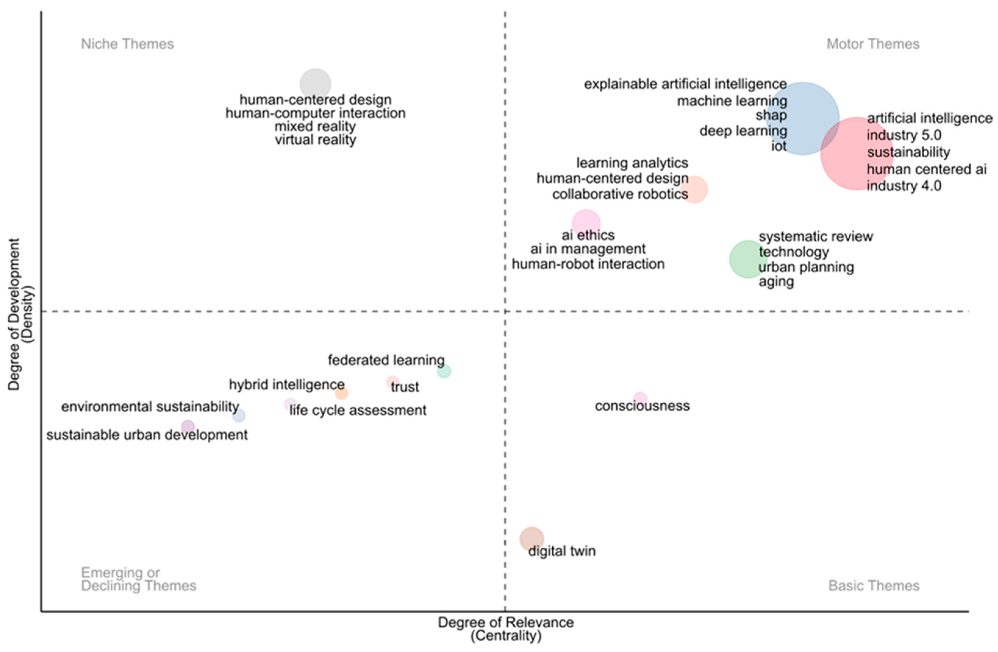 Figure 8), which may affect the weight and positioning of some keywords: it is not possible to include a thesaurus that merges terms such as “explaniable ai” with “explainable artificial intelligence”. Therefore, the software places in different quadrants keywords that address the same topic, unlike what occurs in