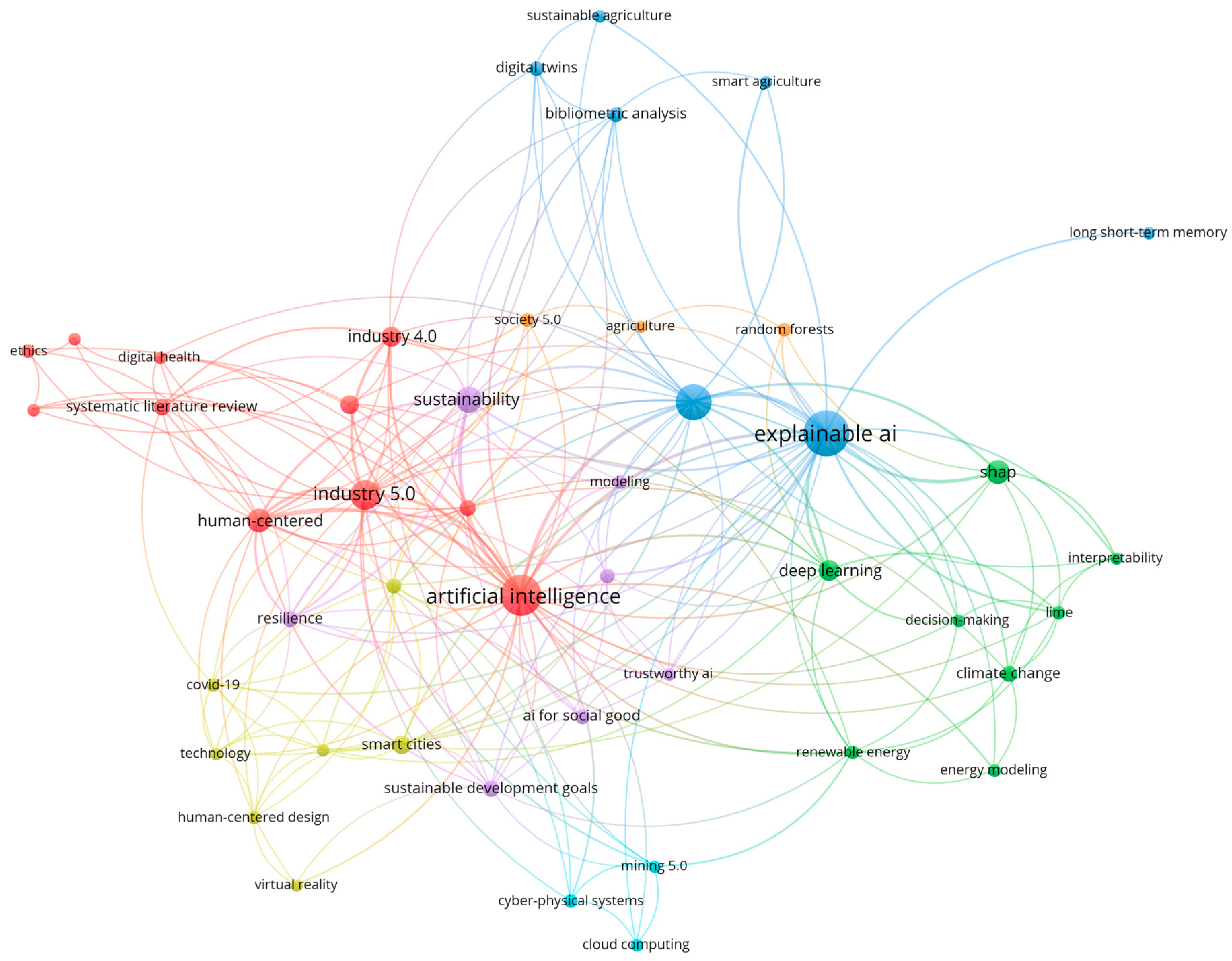 Figure 10 reveals an architecture organized into interdependent poles, focusing on the most prominent nodes: “artificial intelligence,” “explainable AI,” “machine learning,” “sustainability,” “human-centered AI,” “sustainable development goals,” and “industry 5.0.” A coherent design emerges across technical capability, governance, human-centeredness, and socio-environmental purpose. The keyword “artificial intelligence” acts as the map’s general hub, connecting intensely to “sustainability,” “industry 4.0/5.0,” “human-centered AI,” and application terms such as “smart cities” and “urban planning,” indicating that the discourse on AI in the corpus is predominantly oriented toward Sustainable Development problems and organizational transformation. “Explainable AI,” together with “machine learning” and “deep learning,” forms the methodological core; links to “interpretability,” “LIME,” and “SHAP” suggest the effective adoption of explainability techniques as a requirement for responsible applications. “Machine learning” functions as the analytical backbone, radiating into domains such as “digital twins,” “energy modeling,” and “agriculture/smart agriculture,” which reinforces its cross-cutting role as methodological infrastructure. “Sustainability” appears as a transversal application node, anchoring connections with “renewable energy,” “climate change,” “resilience,” and responsibility-oriented initiatives such as “AI for social good” and “trustworthy AI,” projecting AI toward environmental and social issues. “Human-centered AI” brings the technical layer closer to ethical and design dimensions, such as “AI ethics,” “human-centered design,” and “human-robot interaction,” signaling concern with usability, accountability, and impacts on people and organizations.