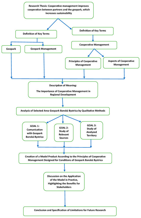 Geoparks in Slovakia collaborate with various components and at multiple levels. This cooperation is based on the delivery of a certain service, which the geopark subsequently offers to its visitors in the form of a created geotourism offer. We cannot speak directly about cooperative management in the true sense of the word. It is a certain form of partnership, which, however, is not equal and the geopark is superior to its management. Before the actual work, an overview of the issue will be made through literature and case studies with similar issues. First of all, it is necessary to signal the current state of geoparks and their partnerships. The result of the analysis will be a scheme where partners and their roles will be identified, as well as their relationship to the geopark management. Then a critical analysis will be carried out where the strengths and weaknesses of such cooperation will be identified. Based on the results of the analysis of the current state, a model of cooperation between the geopark and its partners based on cooperative management will be designed, where the weaknesses of the current state will be eliminated. The result should be cooperation where individual components gain not only benefits, but also a sense of full-fledged partnership and not just the position of a subcontractor. Subsequently, an analysis of the cooperative management model was made, where the strengths and weaknesses of such cooperation will be described. We assume that compared to the current state, the cooperative model will contain a minimum number of weaknesses. The next step will be to apply the model to an existing geopark and create a product that would point out the advantages of cooperative management directly in practice. All partners who have something to offer in a given product and of course the management of the geopark would be involved. The application of the model will be in the territory of the Bystrica geopark, which has partners as well as existing geotourism product. Figure 1 display the scheme of the research design.