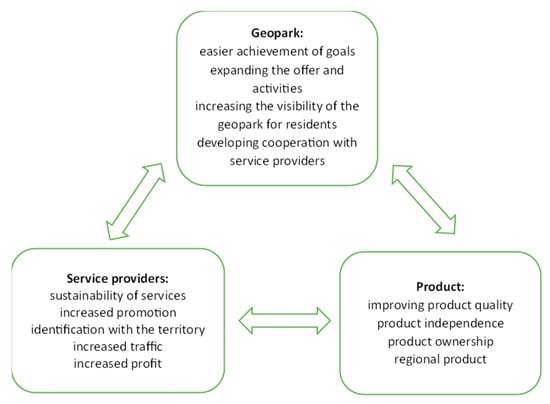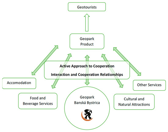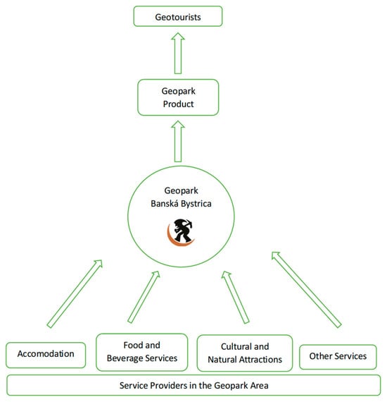 All these categories of services provide their service to the geopark, which is shown by arrows pointing to the central entity—Geopark Banská Bystrica. Subsequently, the geopark creates the resulting product and provides it to the market and to visitors to the geopark. The relationship between Geopark Banská Bystrica and the partners is a partnership, but it is clear that the partners are not on the same level. Only the geopark has access to the product. The partners do not have the opportunity to enter the product, nor do they have the opportunity to enter its creation. Although the product is the result of combining regional services, geological heritage, and educational elements, which are managed under the banner of the geopark, for the partners, it is a foreign product, and therefore, they do not have responsibility for its sustainability.