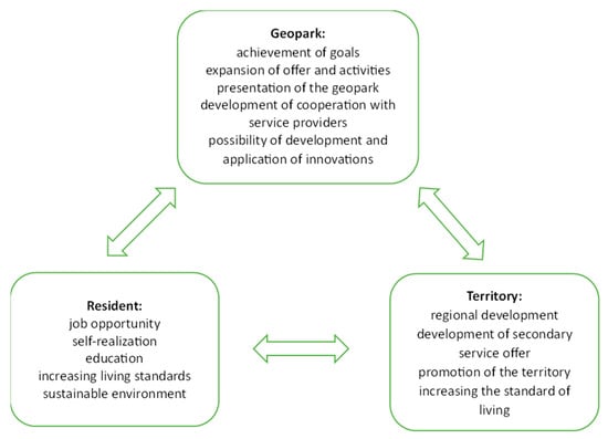 Other entities are those that also fulfill the main goals of the geopark, such as education, protection, promotion in geosciences, and regional development. It would be appropriate to identify key groups of entities according to these goals, and what geoparks actually have done. The next step in development will be to address educational institutions with the aim of starting cooperation in the form of active involvement of students in practice. From their portfolio, we would select: educational institutions such as a university focused on the study of geosciences, conservation institutions such as State nature protection, promotion of geosciences, e.g., destination organization of the tourism, regional development, e.g., local producers. Educational institutions are very important subjects in general in fulfilling the function of a geopark. When expanding the model and designing a general methodology applicable to geoparks, it is necessary to highlight the position of educational institutions in this process. Since education at any level is key.