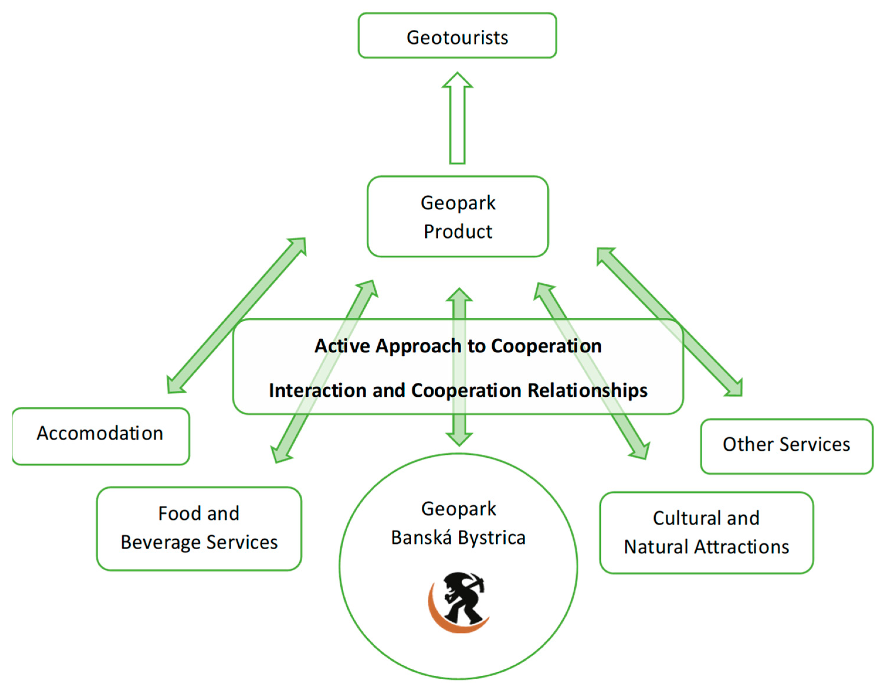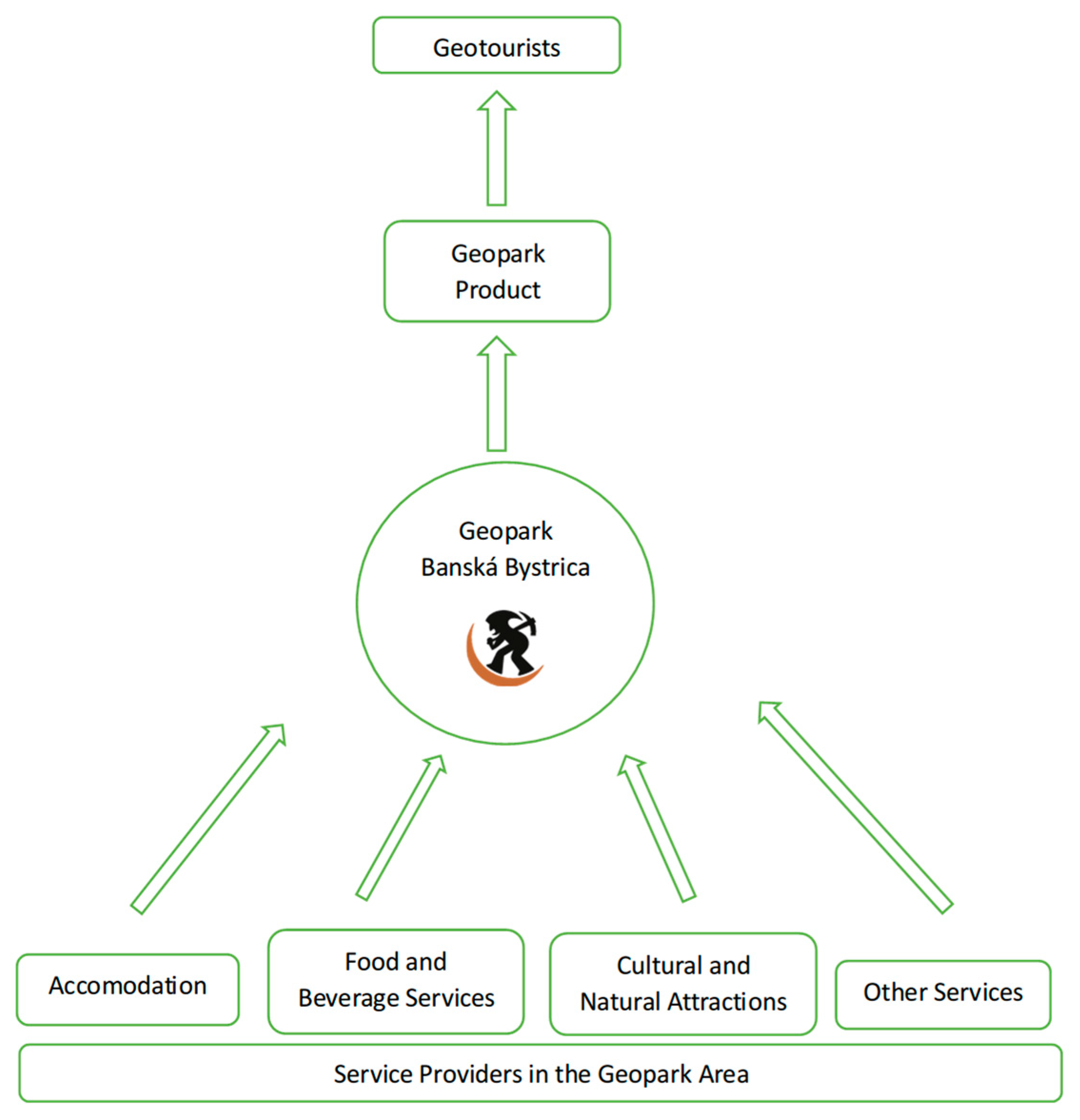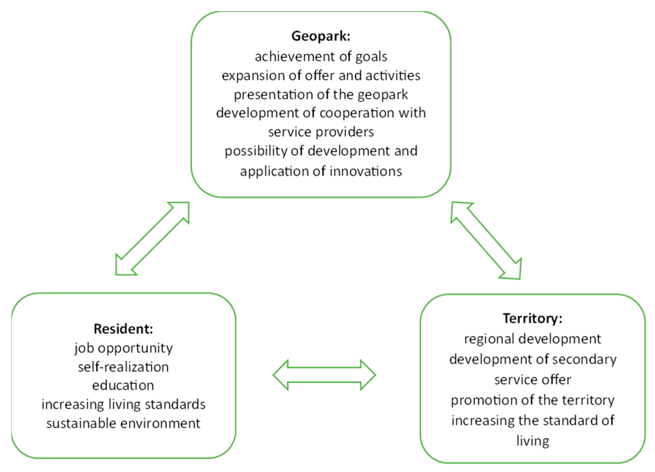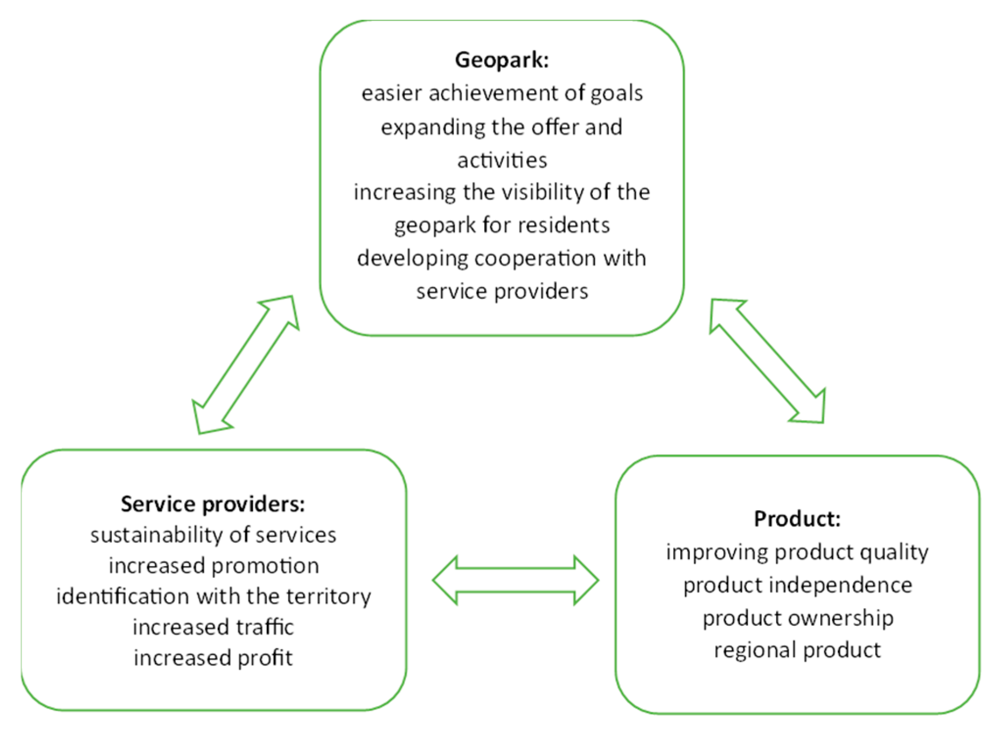 46]. The benefits can be divided between the geopark, the service provider (stakeholder) and the service recipient (tourist). This relationship and its impact on individual components can be seen in