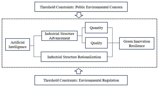A review of the literature reveals that scholars have examined the impact of AI on green technological innovation [4,5,6], green innovation efficiency [7,8], green investment [9], green finance [10,11,12], and green economic development [13,14]. However, most studies focus on AI’s direct impact on green innovation output, overlooking its dynamic role in shaping system resilience. AI can offer precise and efficient strategies for enterprises, enhancing their ability to respond, recover, and innovate in the face of complex environmental changes [15], thereby boosting green innovation resilience. Therefore, it is crucial to explore AI’s influence on provincial innovation resilience. From an industrial structure perspective, AI improves production efficiency, enhances industry scalability and innovation capabilities, promotes industrial advancement, and strengthens the capacity to address environmental challenges [16,17]. Furthermore, AI enables more efficient production processes, allowing for continuous adjustments in industrial structure and fostering greater rationality [18], which enhances resilience to external shocks. However, the mediating effects of industrial structure advancement and rationalization in the context of AI diffusion remain underexplored. Additionally, how the “dual pressure field” formed by public environmental concern and environmental regulation shapes AI’s role in green innovation resilience requires further investigation. Therefore, this study examines the threshold effects of public environmental concern and environmental regulation, analyzing their roles in AI’s influence on green innovation resilience.