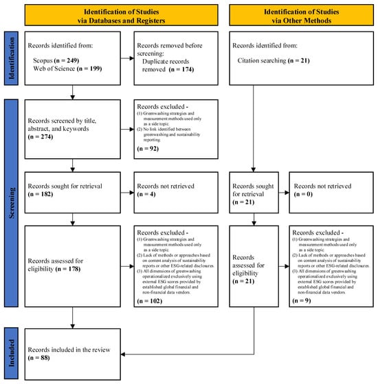 Next, we defined the inclusion and exclusion criteria for the review (Table A3 in the Appendix A). A study was considered eligible if the publication explicitly addressed the phenomenon of greenwashing in the context of sustainability reporting as a primary research topic. In addition, the study had to discuss greenwashing strategies or methods for measuring greenwashing that were grounded in content analysis of sustainability reporting. We also specified that each study must operationalize at least one dimension of greenwashing through content analysis of sustainability reports or other corporate disclosures containing ESG-related information.