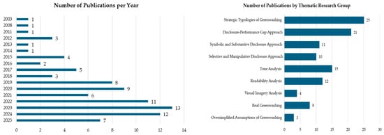 In the final step of the SLR, a thematic content analysis was conducted to extract and synthesize data relevant to the research questions. A narrative synthesis approach was applied, combining systematic textual summarization with interpretive analysis of the findings, as appropriate given the objectives of this review [61,62]. Two researchers independently reviewed and coded the full texts of all publications to ensure the validity and reliability of the findings. A combined deductive–inductive coding strategy was used. At the deductive level, the coding framework was structured around two main thematic groups of studies, corresponding to the research questions: (1) articles addressing strategic typologies of greenwashing in sustainability reporting and (2) articles presenting and applying content-analysis-based approaches and analytical techniques for measuring greenwashing.