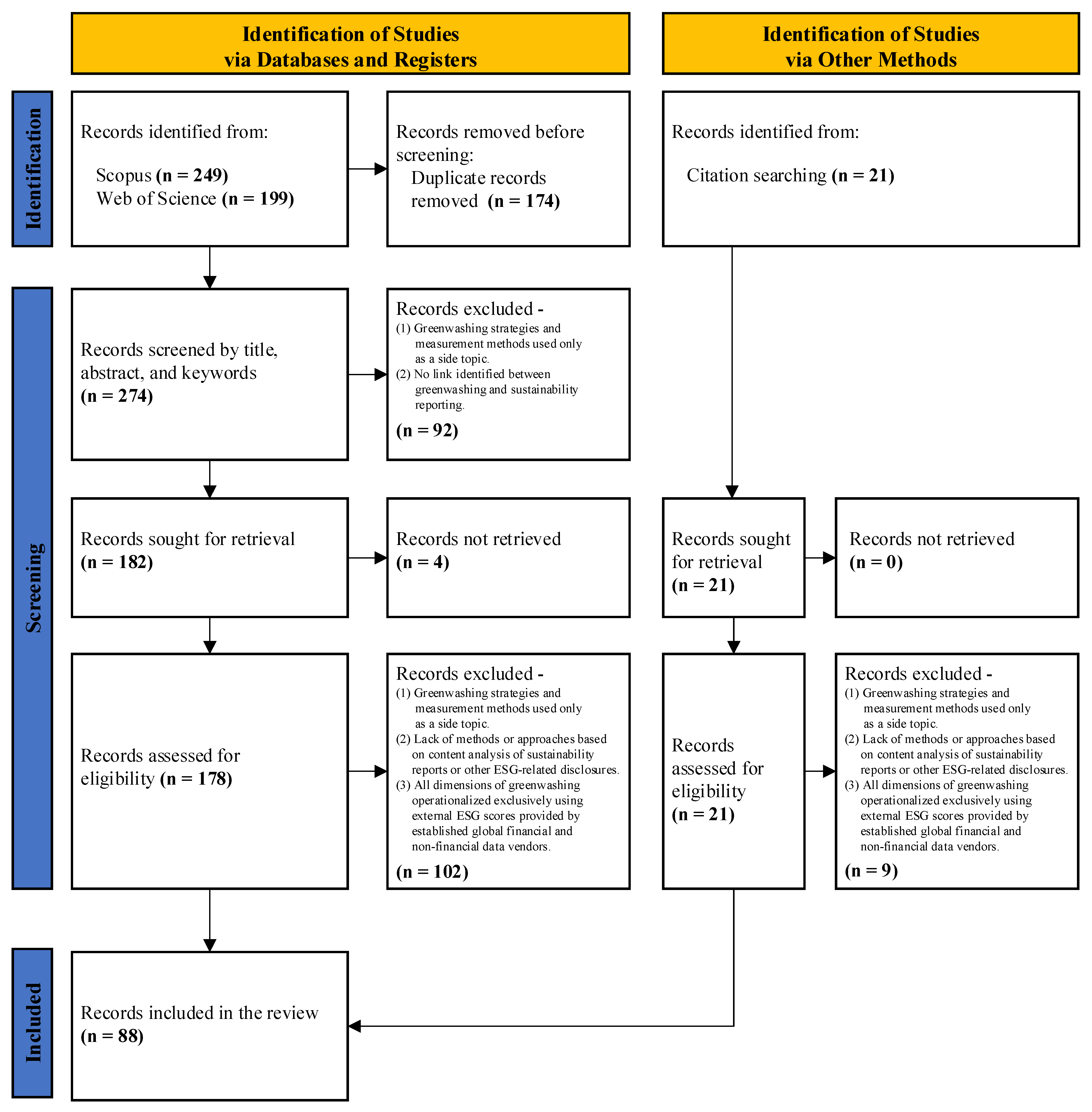 | Web of Science | TS=((“greenwash*” OR “green wash*” OR “green-wash*” OR “decoupling” OR “cheating” OR “obfuscation” OR “deceptive”) AND (“sustainability report*” OR “sustainable development report*” OR “ESG report*” OR “corporate social responsibility report*” OR “CSR report*” OR “responsib* report*” OR “corporate citizenship report*” OR “triple bottom line report*” OR “TBL report*” OR “GRI report*” OR “Global Reporting Initiative report*” OR “sustainable development goal* report*” OR “SDG* report*” OR “integr* report*” OR “non-financ* report*” OR “environm* report*” OR “green report*” OR “GHG report*” OR “greenhouse gas report*” OR “sustainability disclosure” OR “sustainable development disclosure” OR “ESG disclosure” OR “corporate social responsibility disclosure” OR “CSR disclosure” OR “responsib* disclosure” OR “corporate citizenship disclosure” OR “triple bottom line disclosure” OR “TBL disclosure” OR “GRI disclosure” OR “Global Reporting Initiative disclosure” OR “sustainable development goal* disclosure” OR “SDG* disclosure” OR “integr* disclosure” OR “non-financ* disclosure” OR “non-financ* statement” OR “greenhouse gas disclosure” OR “GHG disclosure*” OR “environm* disclosure” OR “green disclosure” OR “carbon report*” OR “carbon disclosure” OR “social report*” OR “social disclosure”)) |