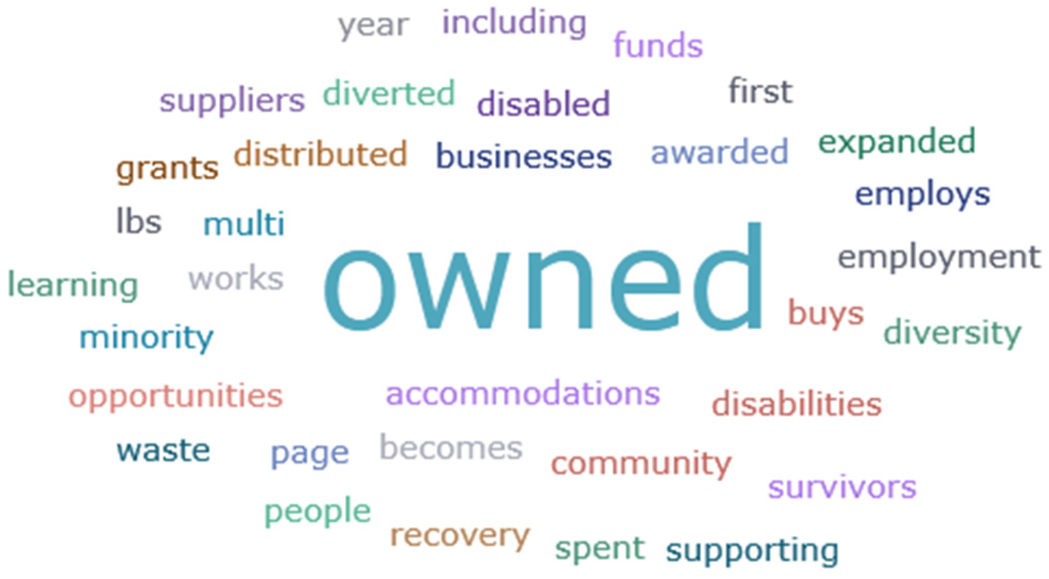 Figure 6). Terms such as “employment,” “jobs,” “connected,” “company,” “program,” and “resettlement” dominate, reflecting the sector’s emphasis on workforce integration, youth employment pathways (e.g., RiseHY), refugee resettlement, and equality-driven hiring practices. The presence of words like “LGBTQ,” “infrastructure,” “legislation,” and “engages” indicates that employment themes are often embedded within broader social responsibility narratives related to inclusion, policy engagement, and community support. Overall, the cloud shows that employment commitments are framed less through quantitative performance indicators and more through socially oriented language stressing opportunity creation and inclusive growth.