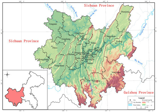Chongqing Municipality, located in southwestern China along the upper reaches of the Yangtze River, is a representative mountainous megacity. The Chongqing Metropolitan Area, situated in the western part of the municipality, encompasses 22 districts and counties with a total land area of 30,200 km2, accounting for about 36% of Chongqing’s total area. The region spans the mountainous and hilly zones of central Sichuan as well as the parallel ridge–valley terrain of eastern Sichuan, characterized by a highly fragmented landscape and pronounced spatial heterogeneity (Figure 1). During the LUCC analysis period, the permanent resident population of the study area was approximately 28.49 million in 2000, 28.85 million in 2010, and 32.09 million in 2020, indicating sustained urban expansion and demographic growth.