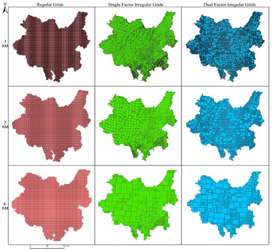 The grid partitions across different resolutions and grid types are illustrated in Figure 2. To evaluate differences in data processing efficiency among various grid types, this study quantified the distribution of sampling points for regular and irregular grids at spatial resolutions of 1 km, 2 km, and 4 km (Table 4). The results indicate that, compared with regular grids, the single-factor irregular grid and dual-factor irregular grid reduced the average number of sampling points by approximately 54.13% and 55.53%, respectively. Specifically, at the 1 km scale, the regular grid contained 30,190 sampling points, whereas the dual-factor irregular grid contained only 13,427 points, representing a 55.52% reduction. At the 2 km and 4 km scales, the reductions were 55.96% and 53.66%, respectively.