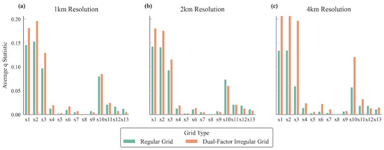 Comparison chart of dual-factor irregular grid and regular grid results. Subfigures show results at different spatial resolutions: (a) 1 km, (b) 2 km, and (c) 4 km.