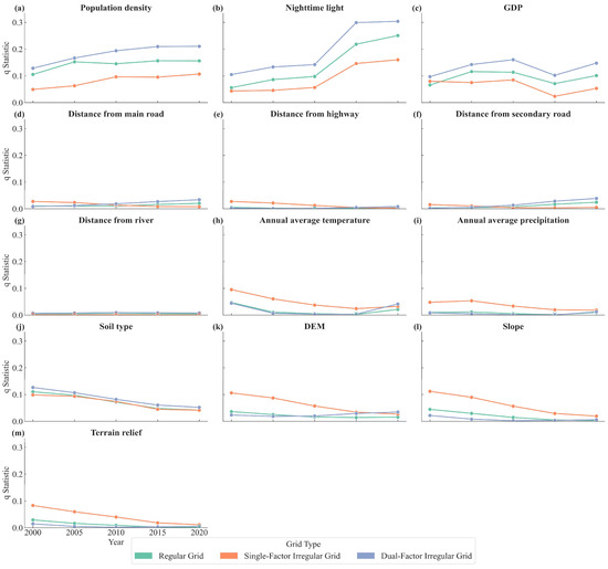 Comparison of the q-values obtained by different grids schemes for major driving factors from 2000 to 2020. Subfigures (a–m) correspond to population density, nighttime lights, GDP, distance to main roads, distance to highways, distance to secondary roads, distance to rivers, annual average temperature, annual average precipitation, soil type, DEM, slope, and terrain relief, respectively.