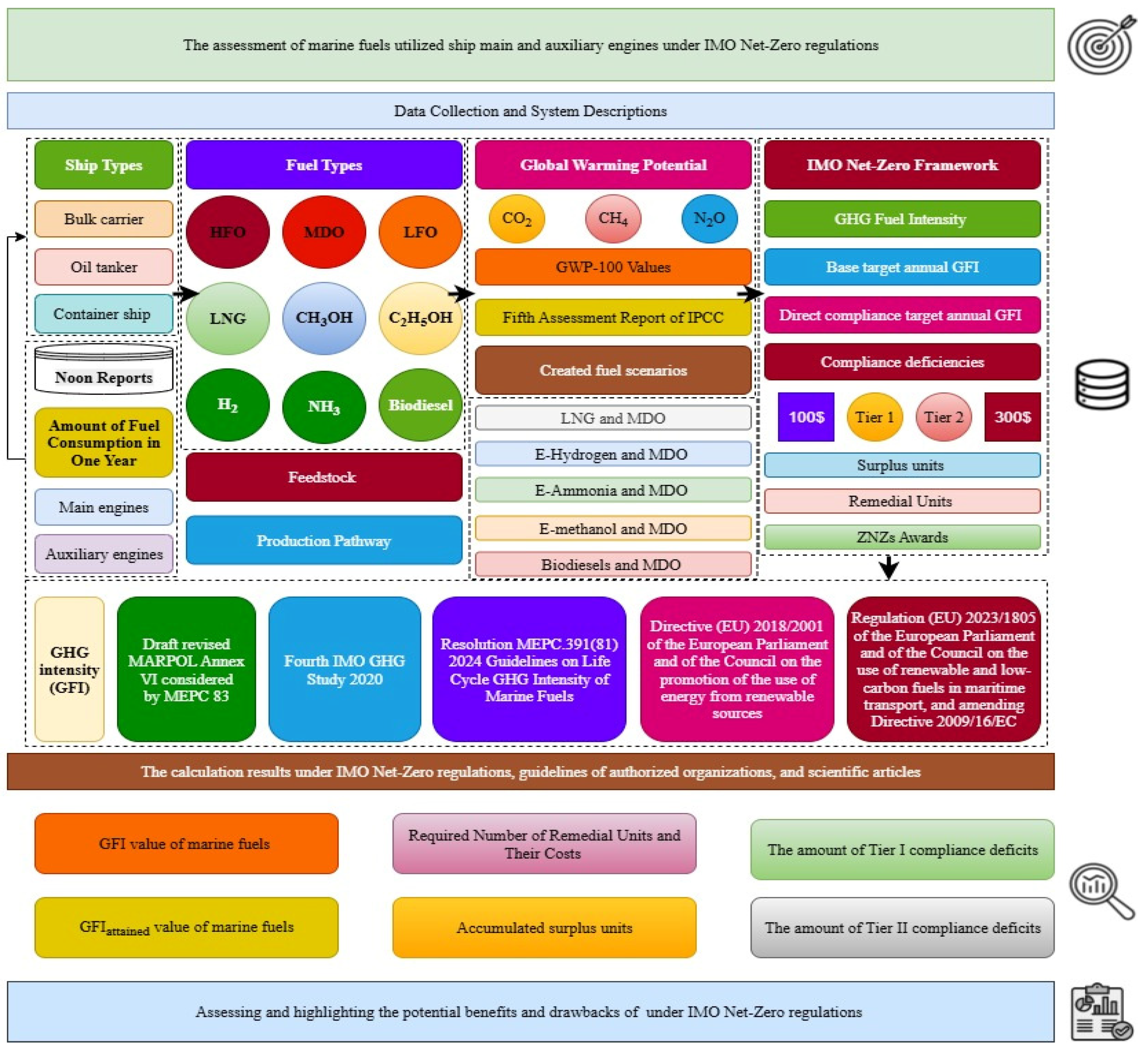 This study assessed marine fuels using annual noon report data from three vessel types within the IMO Net Zero Framework, which is based on the GFI metric encompassing life cycle GHG emissions as defined by the MEPC. The paper differentiated itself by introducing an integrated approach that combines life cycle assessment with IMO Net-Zero regulatory requirements, enabling a holistic evaluation of marine fuel pathways in terms of both environmental performance and compliance.