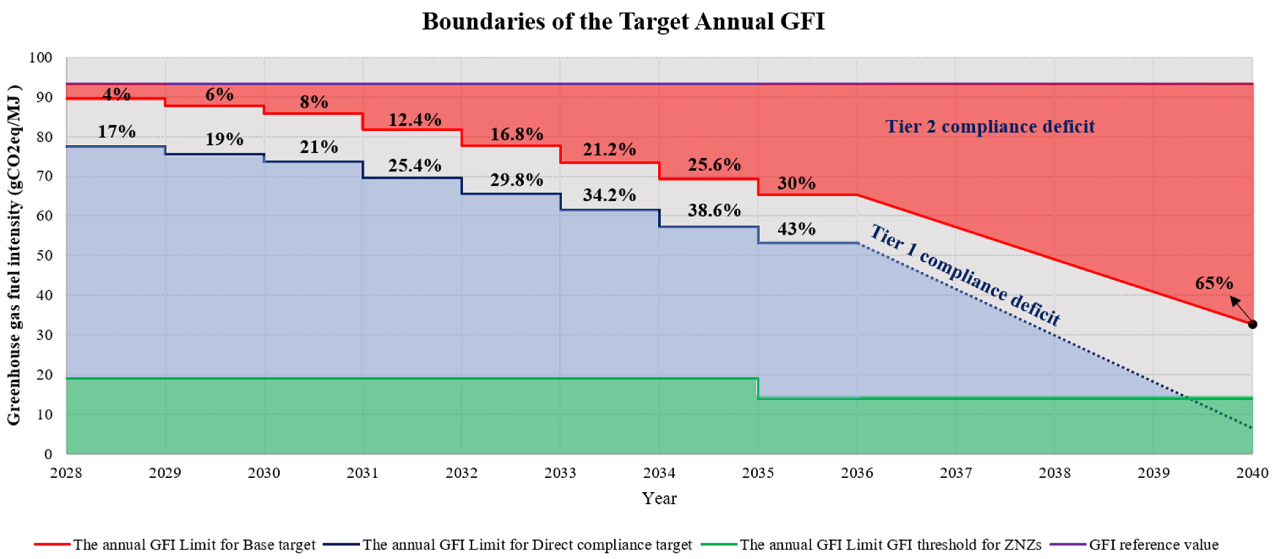 Figure 2. The base and direct compliance target thresholds have been progressively lowered from 2028 to 2035 for marine vessels required to comply with the GFI target. Equation (3) is utilised to calculate the GFI