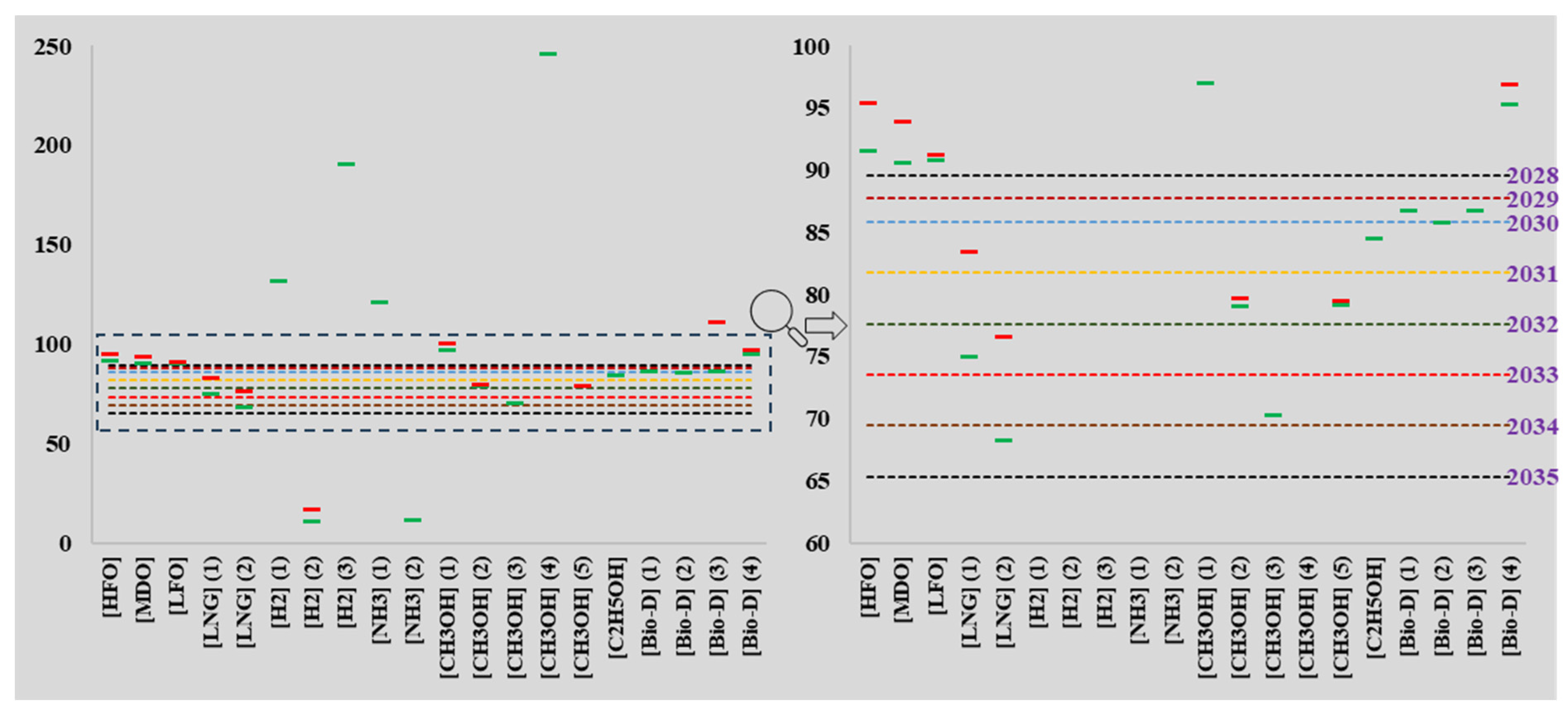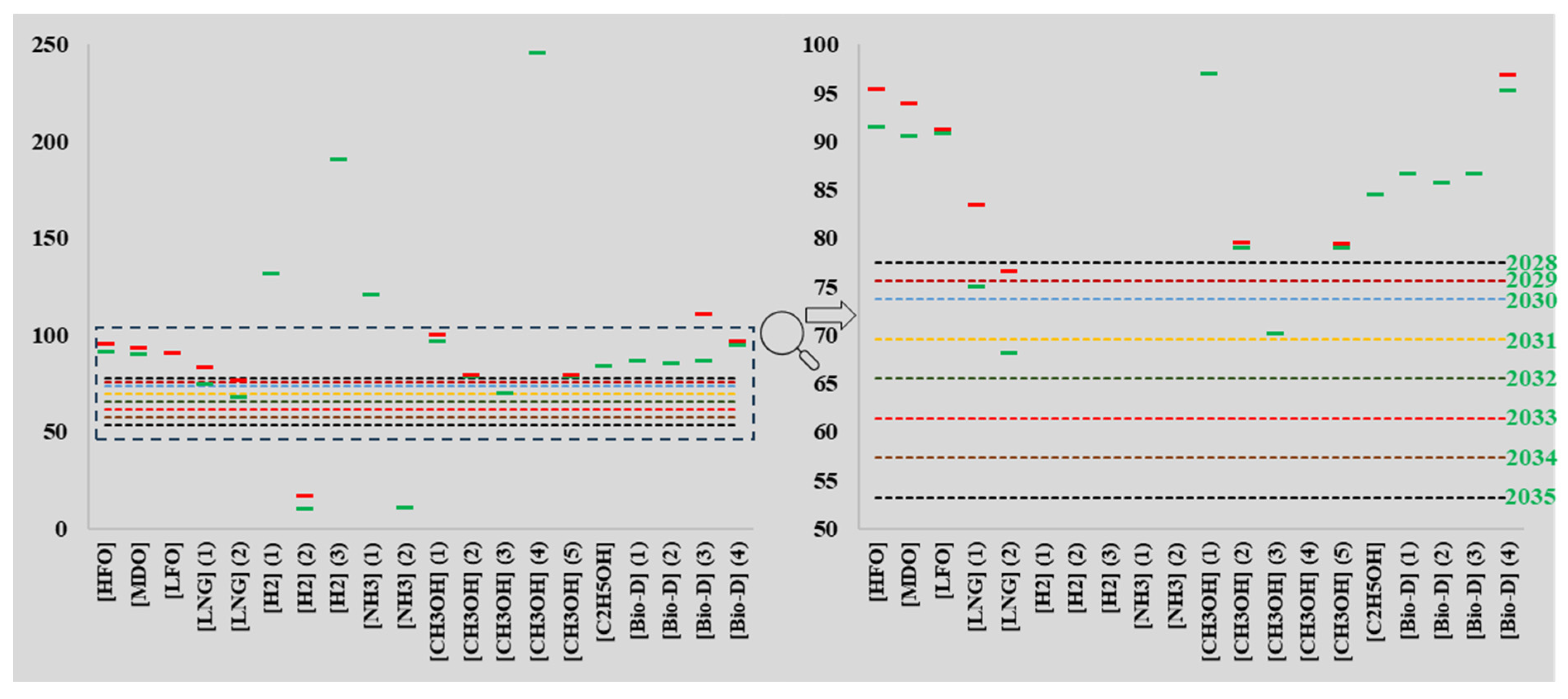 Our results indicate that the adoption of alternative fuels significantly improves compliance with the IMO Net-Zero Framework by reducing the attained GFI values compared to conventional fossil fuels. This outcome aligns with Bengtsson et al. [