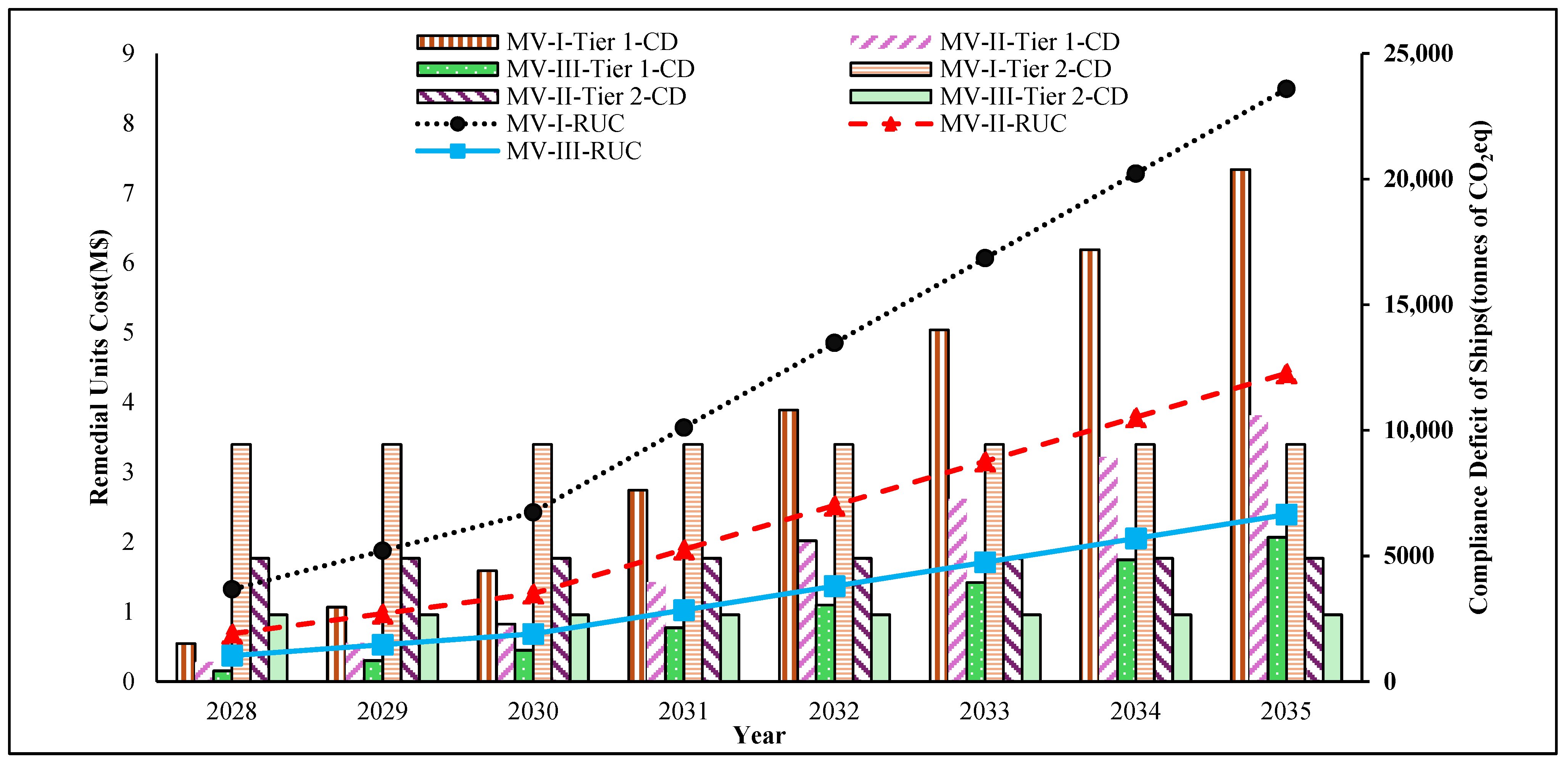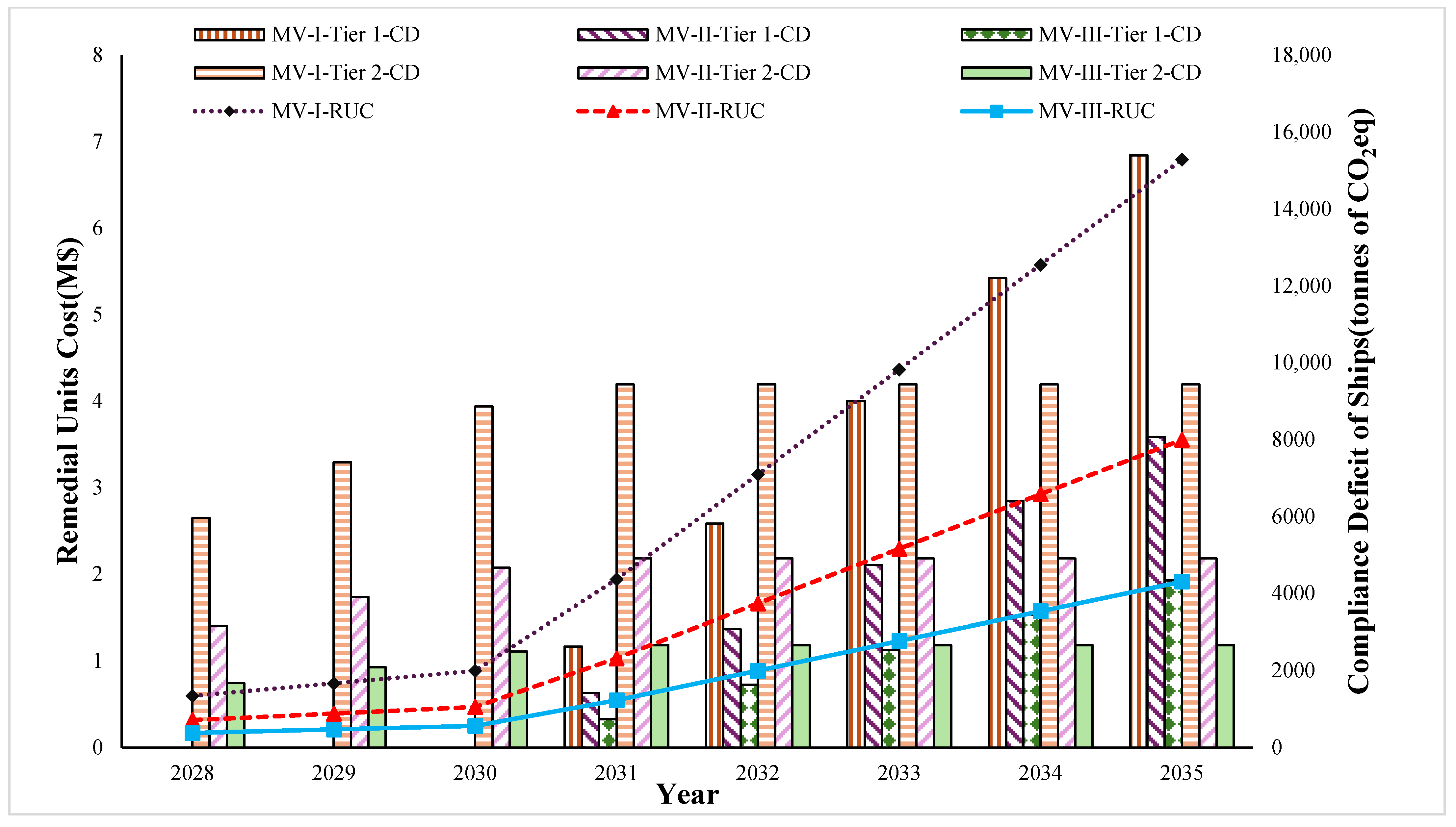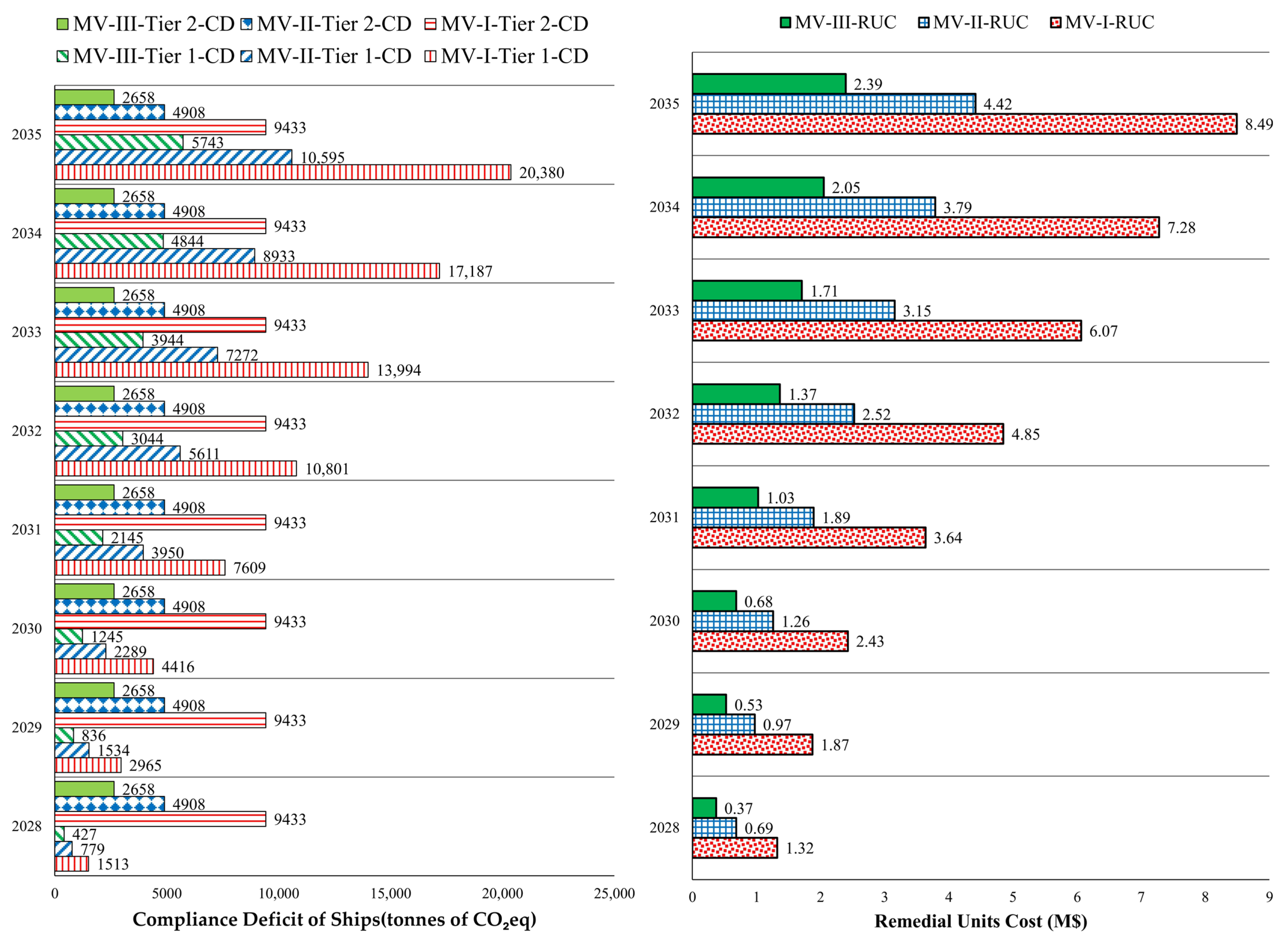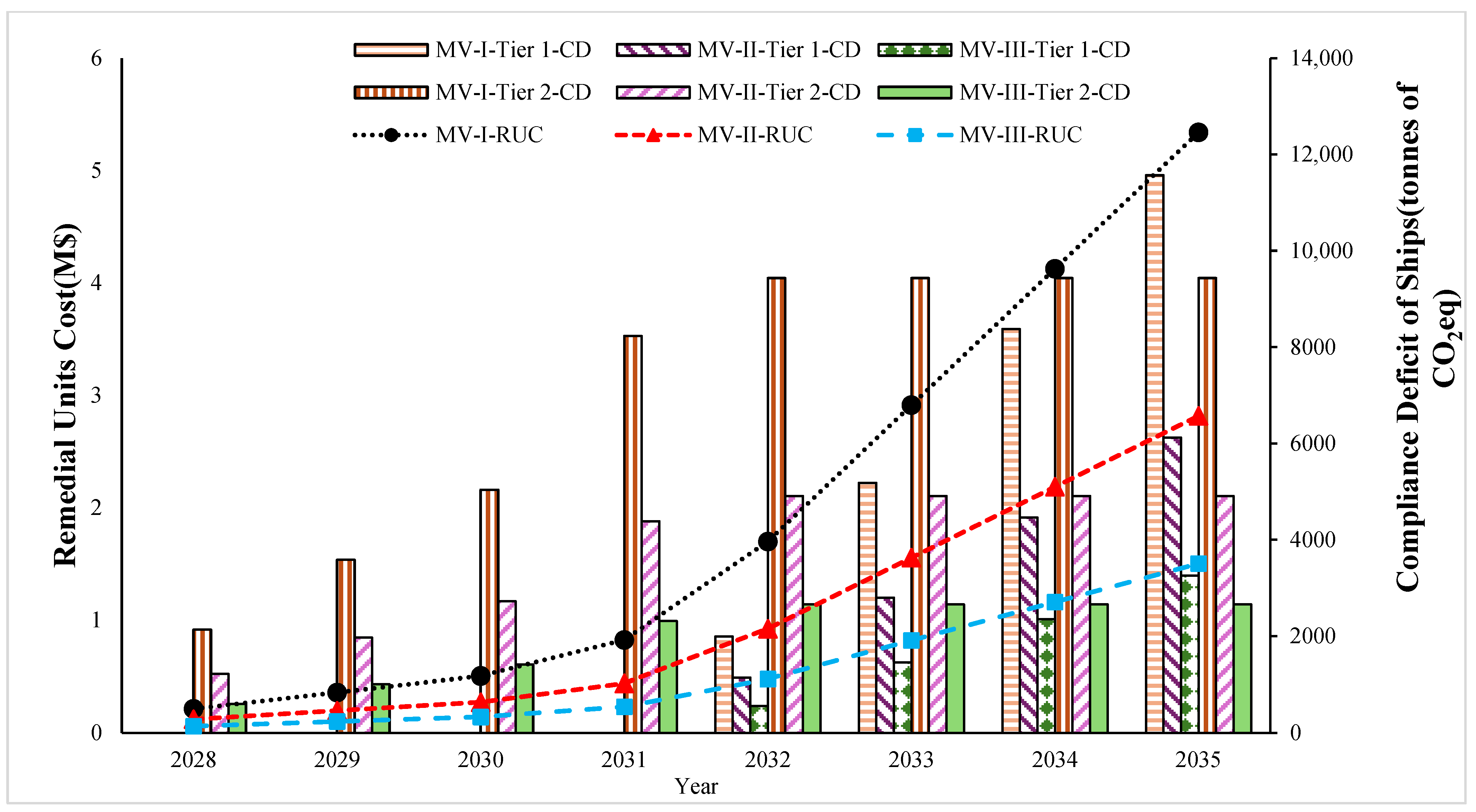 By the end of 2030, the introduction of the Tier 2 compliance deficit will lead to an exponential increase in the costs of remedial units. By the end of the 2035 reporting period, the costs for the ships’ remedial units reach USD 7.12 million, USD 3.72 million, and USD 2.01 million, respectively. These costs are nearly comparable to those incurred by ships operating with conventional fuels.