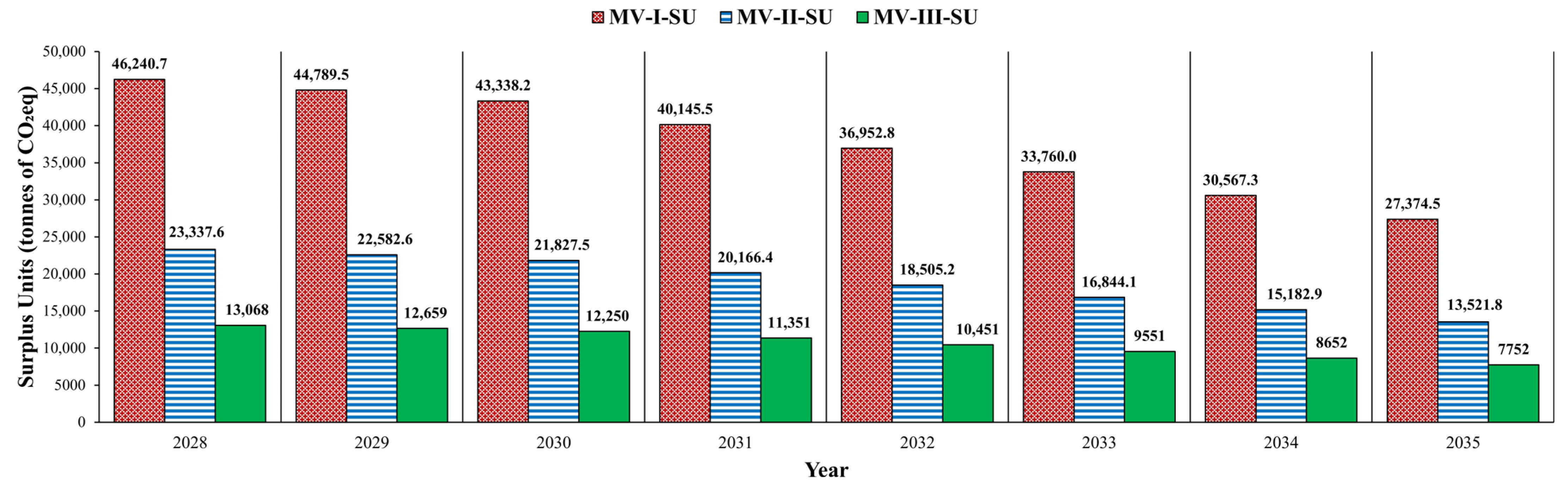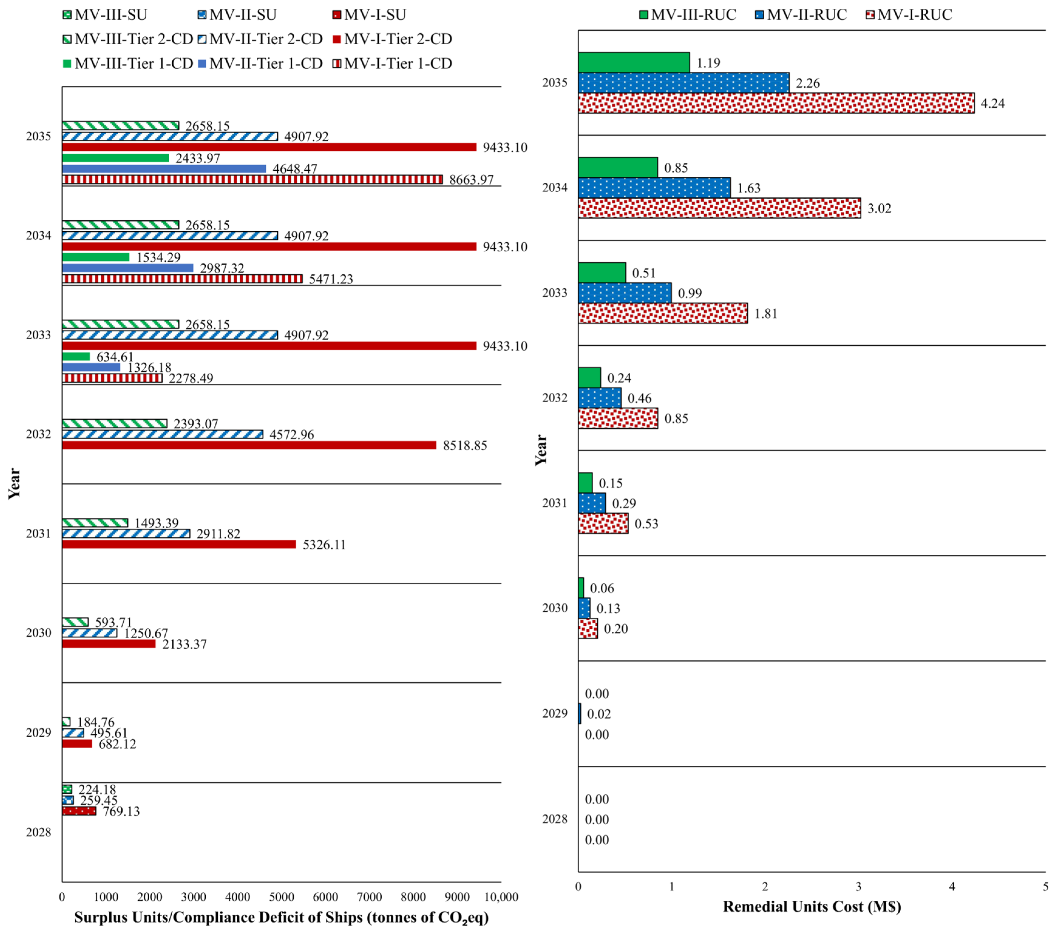 By the end of 2029 and 2030, the MV-I and MV-III vessels have accumulated 2550.9 and 653.5 tonnes of CO2eq surplus units, respectively. The use of these surplus units significantly mitigates the compliance deficits of the ships in 2031. Remedial units costing USD 0.0092 million and USD 0.0124 million are sufficient to balance these deficiencies. The surplus units gained by the MV-II vessel by the end of 2029 fully cover the deficit at the end of 2030, while the surplus units gained at the end of 2030 cover 38% of the deficit arising at the end of 2031, reducing the compliance deficit for MV-II to 1515.87 tonnes by the end of 2031. By that time, the cost of required remedial units for the ships will be USD 0.58 million, USD 0.15 million, and USD 0.17 million, respectively.